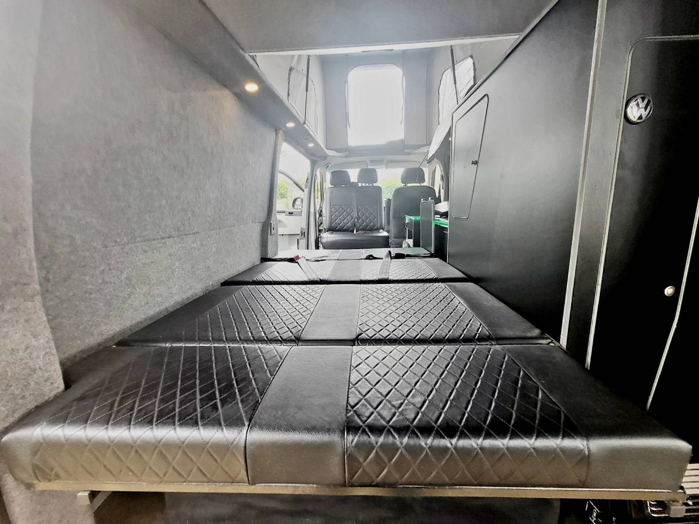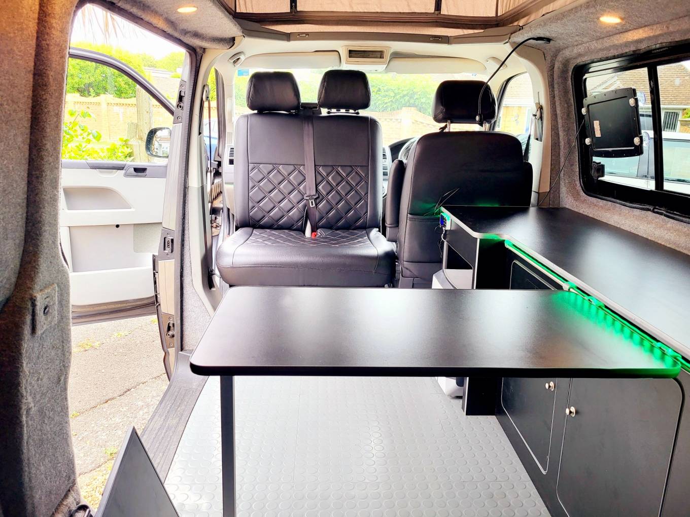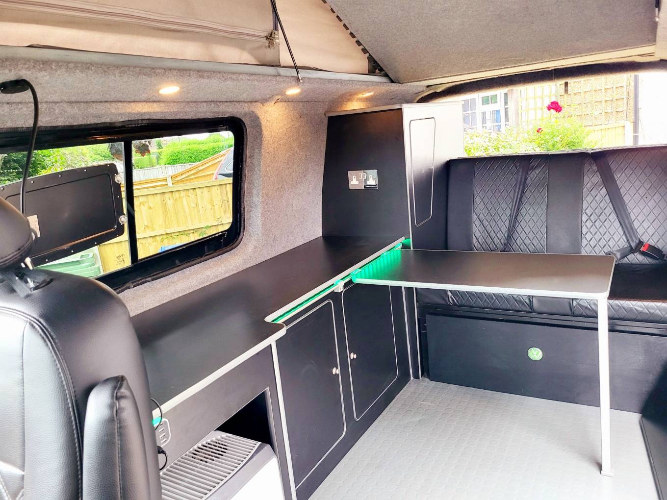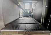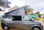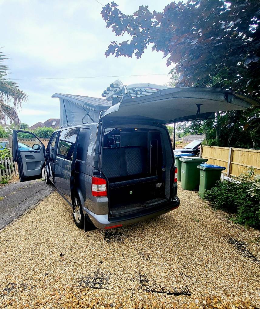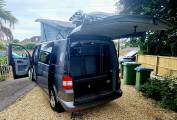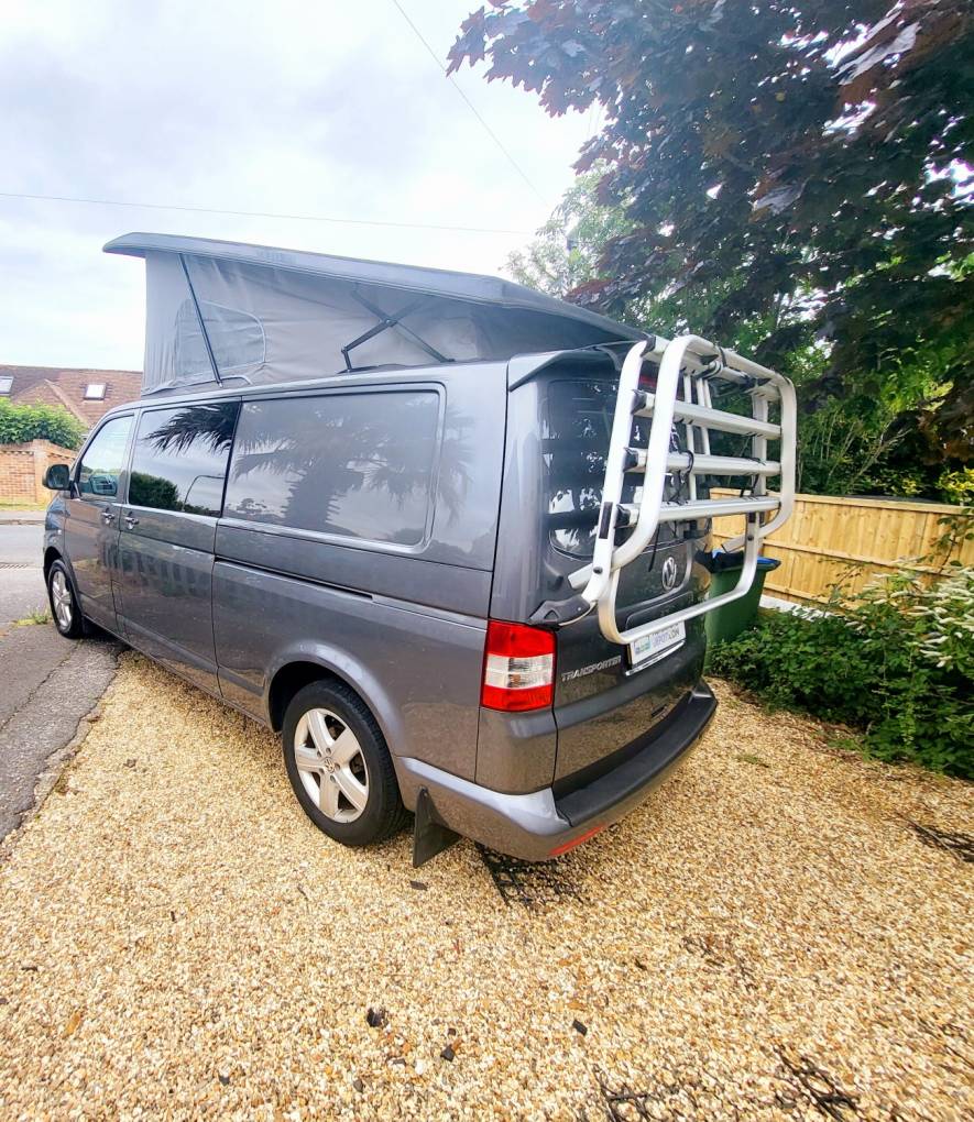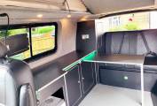 With its gun metal grey bodywork and all black interior this is an amazing LWB campervan that is not to be missed. It is a 4 berth, 5 belted campervan with R&R bed, with the other double bed being above in the forward-facing pop top roof. The double front seat swivels to create a great area to relax in once you have reached your destination. There is also a 12v/240v removable fridge. 1200w Inverter and 240v sockets, a USB port and a control panel supply and battery charge condition. The van has 240v hook up with 12v leisure battery, LED lights and USB ports. Privacy glass throughout. The habitation window opens to vent the area whilst using the rear hob and grill. All windows have thermal black out curtains. Also included is a portable 1.3kw gas heater, OEM 4 Bike rack 19" TV with removable head rest bracket.