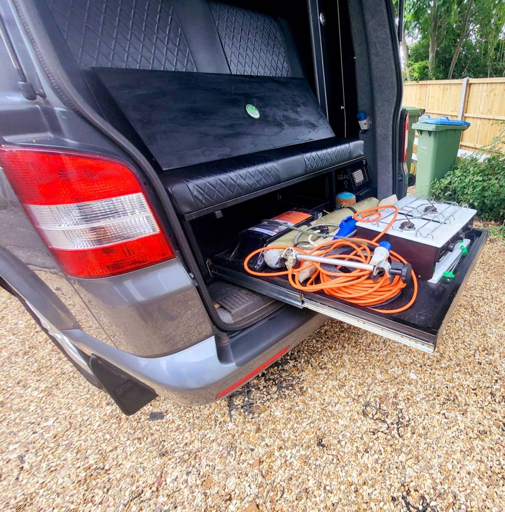There is also a slide out shelf under the bed that provides a brilliant cooking area at the rear as well as convenient storage of your camping bits including a portable 2 burner gas hob and grill