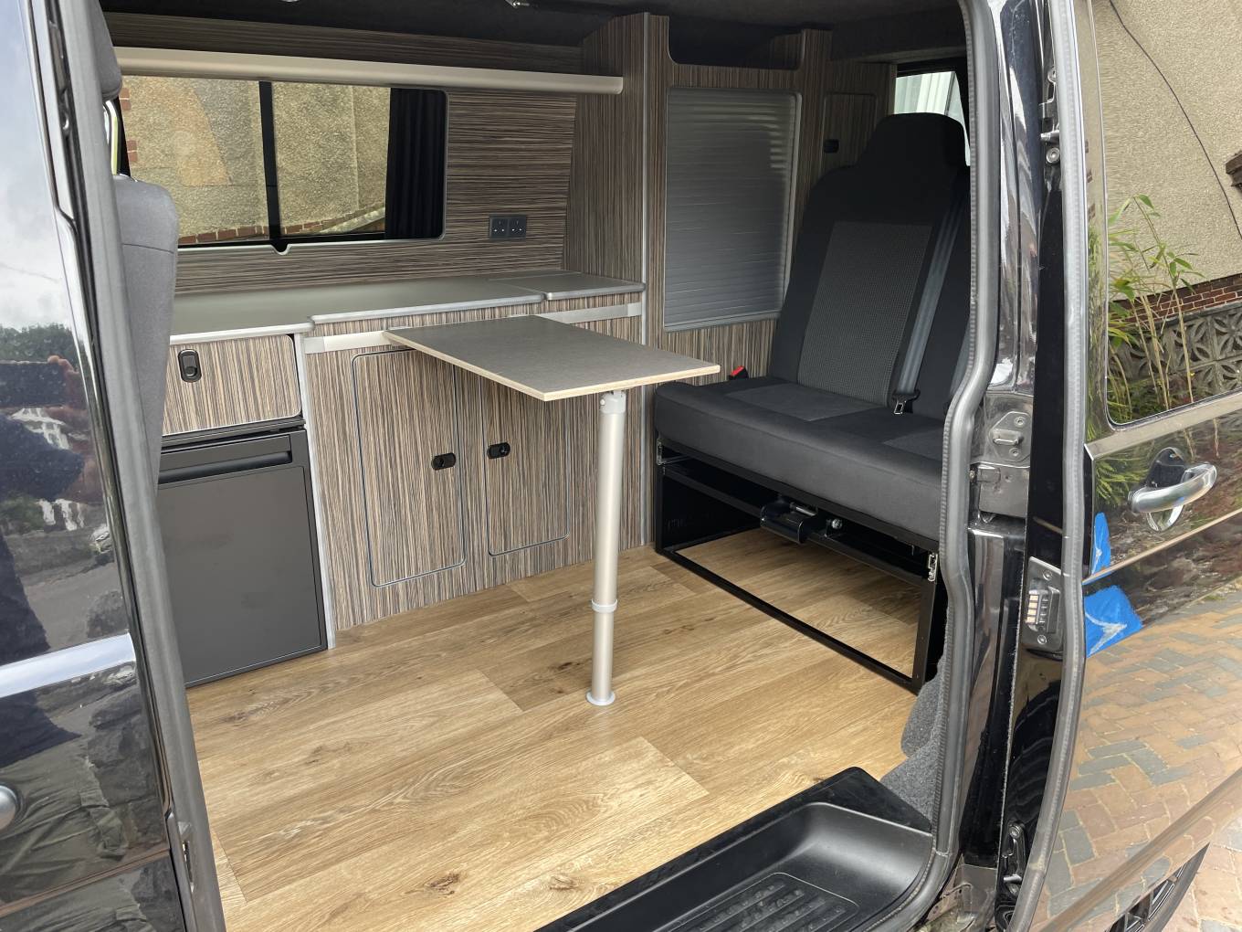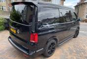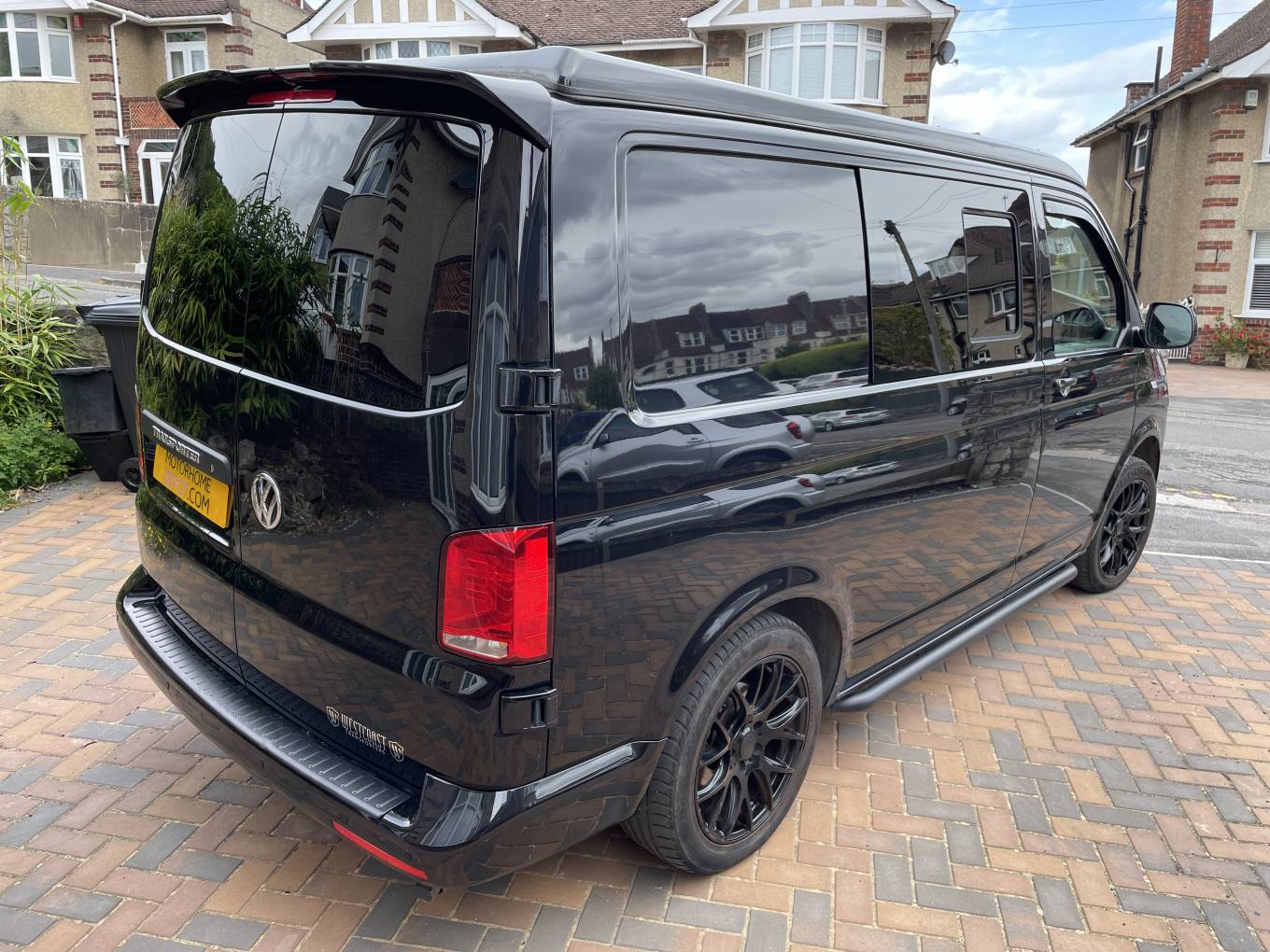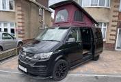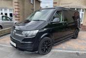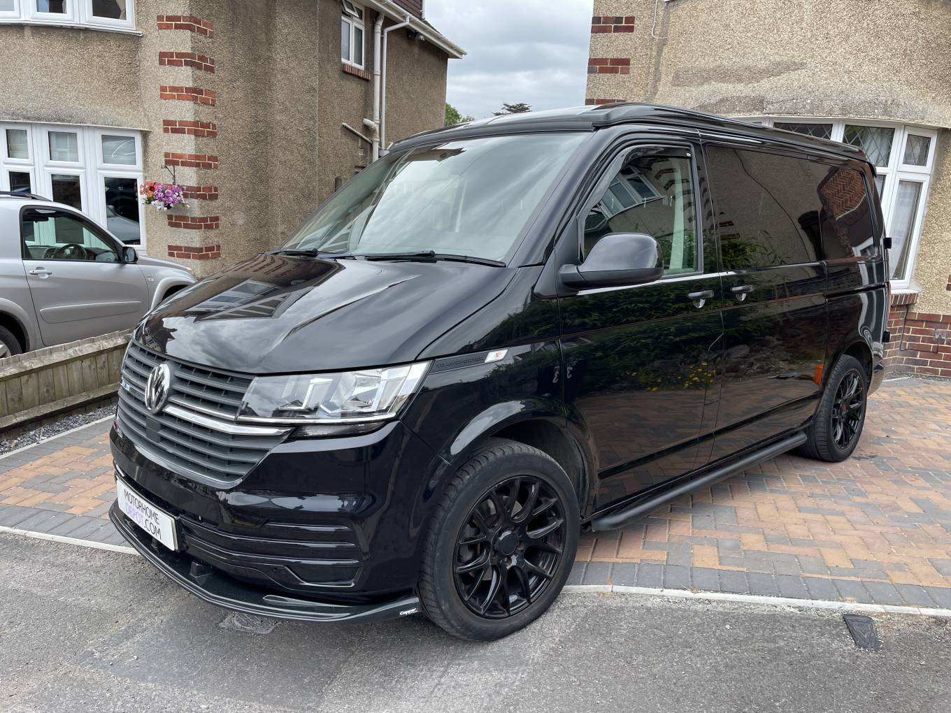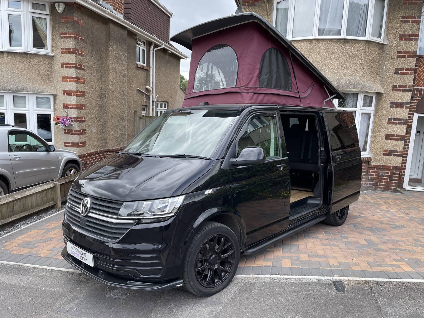 New To Market, a superb 2020 VW T6 Transporter (T30) pop top campervan converted by specialists "Westcoast Transporters" finished in black, with black side bars and black alloys. A stylish camper that really stands out whether at the beach, campsite or on the road.
