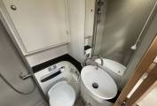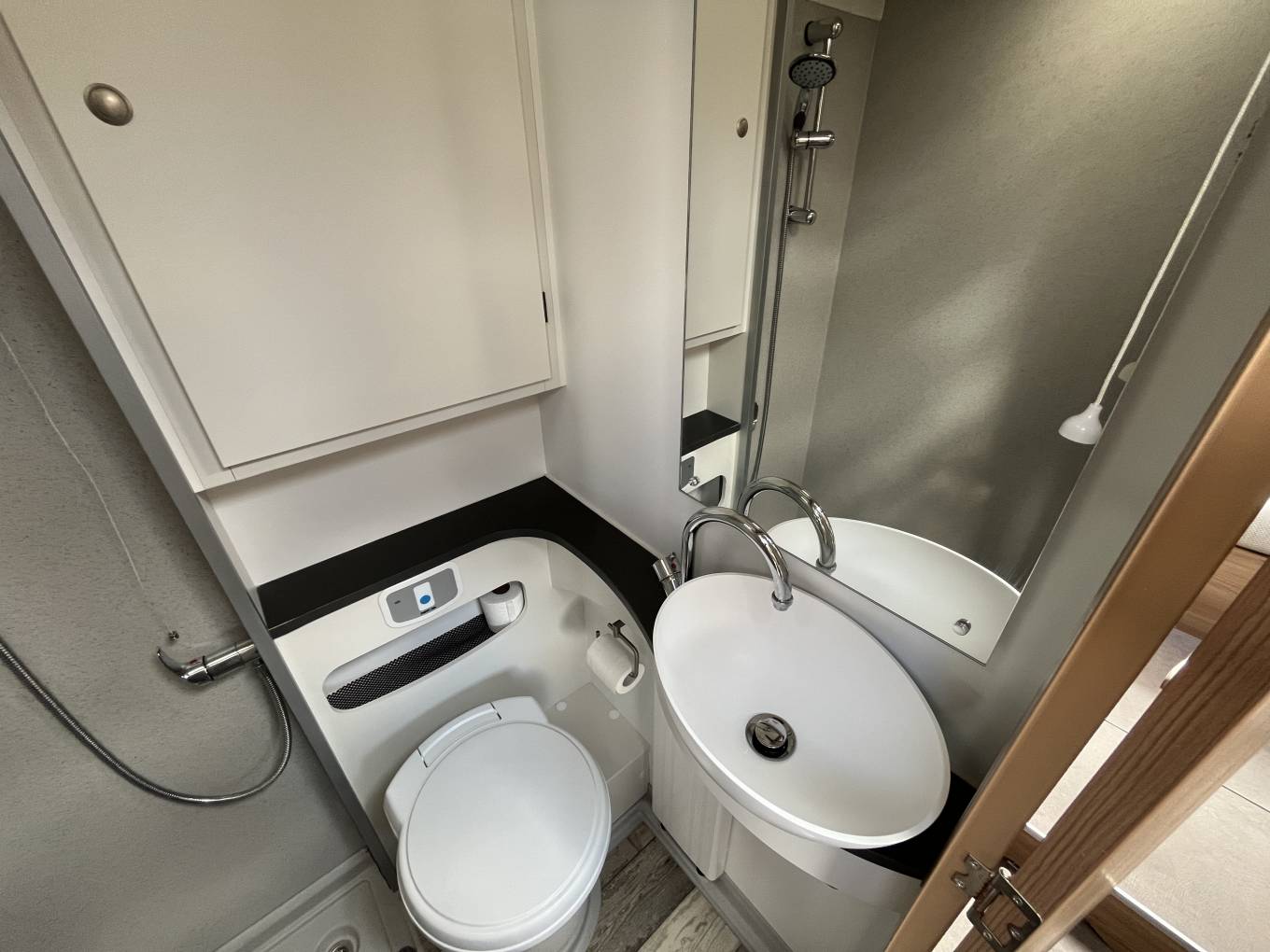 occupants. The motorhome also includes a well-appointed bathroom with a