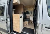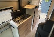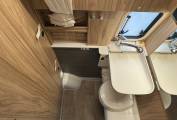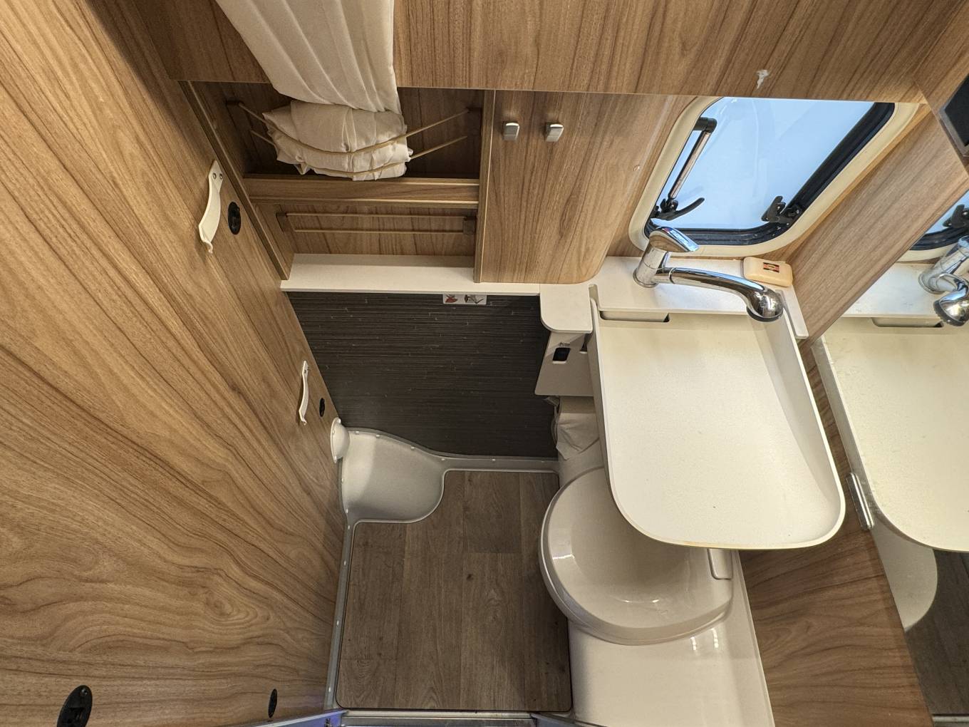 Moving through we come to the kitchen area which has a tall fridge freezer, 2 ring gas hob and sink with mixer tap, again there no shortage of storage in and around this area. Adjacent to the kitchen is the washroom which includes a Thetford cassette toilet, sink with hot and cold taps with shower cubical.