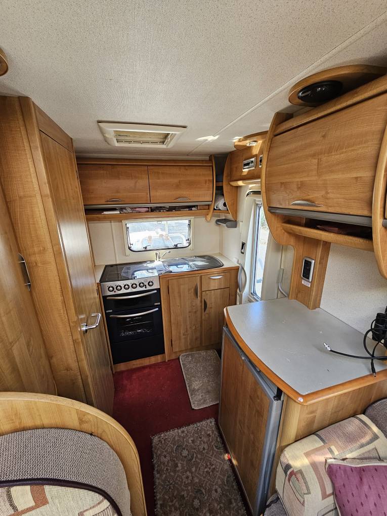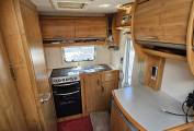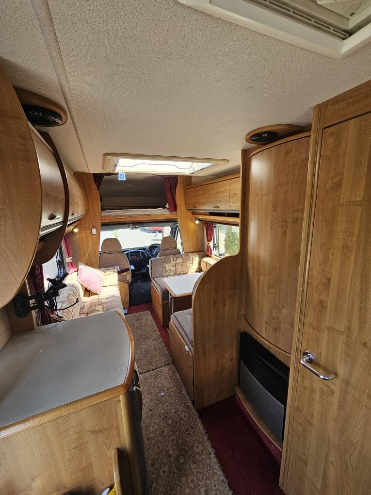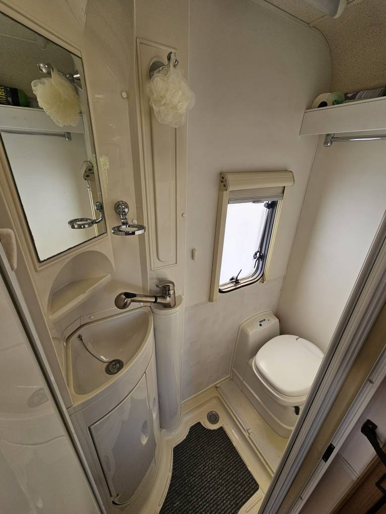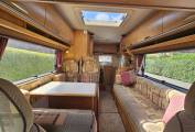 The interior layout is both practical and inviting. The centre dinette is perfect for shared meals and socialising, and the end kitchen is fully equipped with an oven, fridge, and essential amenities, making it easy to prepare meals on the go. Whether you're whipping up a quick snack or a gourmet meal, you'll find everything you need within reach. The motorhome is also fitted with heating throughout, ensuring you stay warm and comfortable even during cooler evenings.