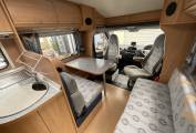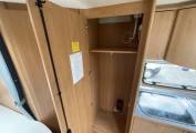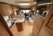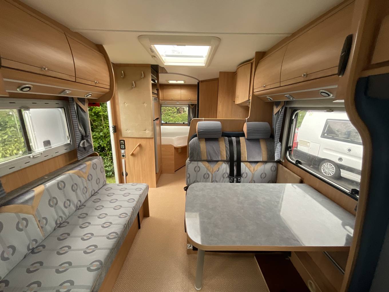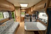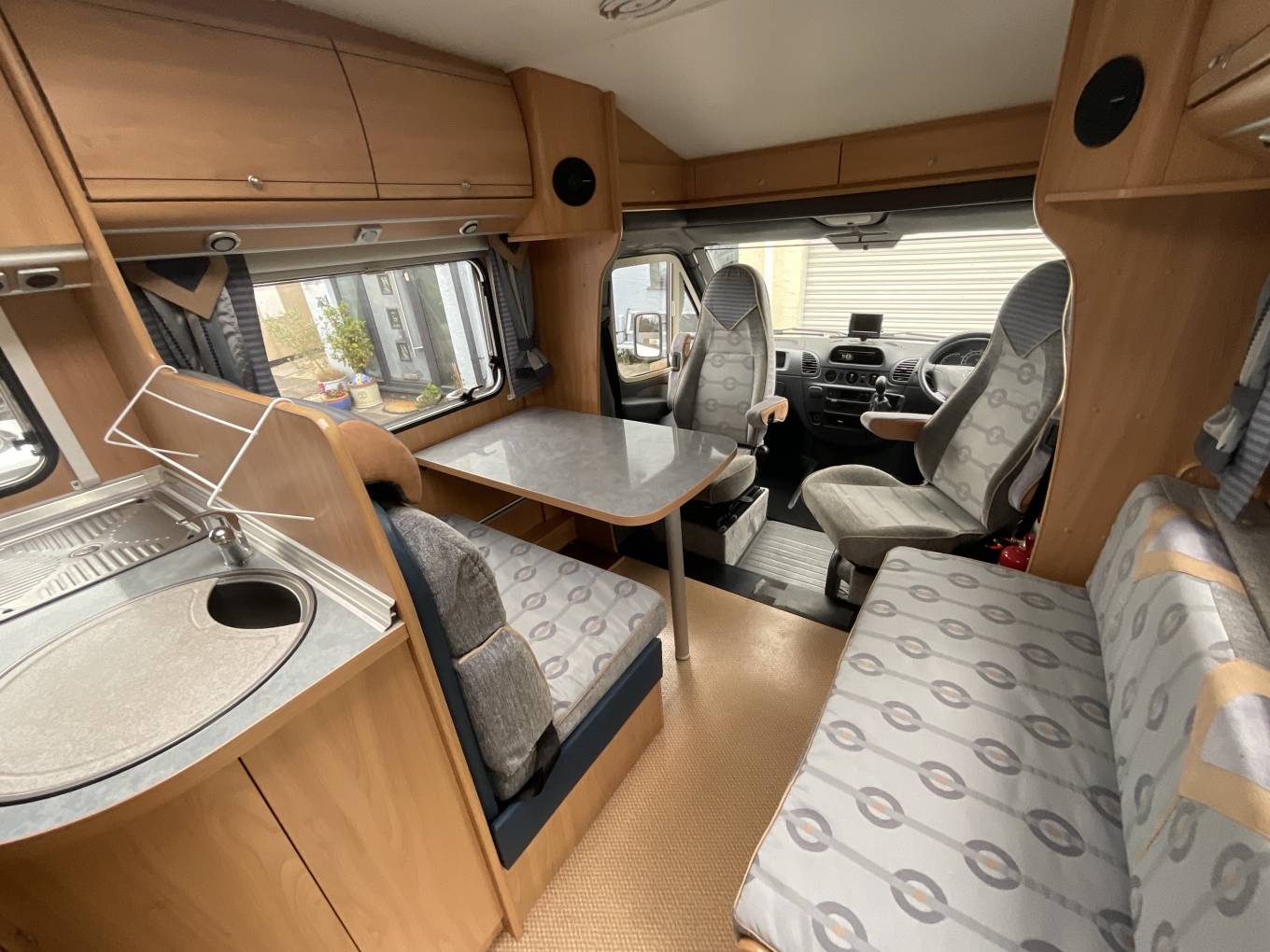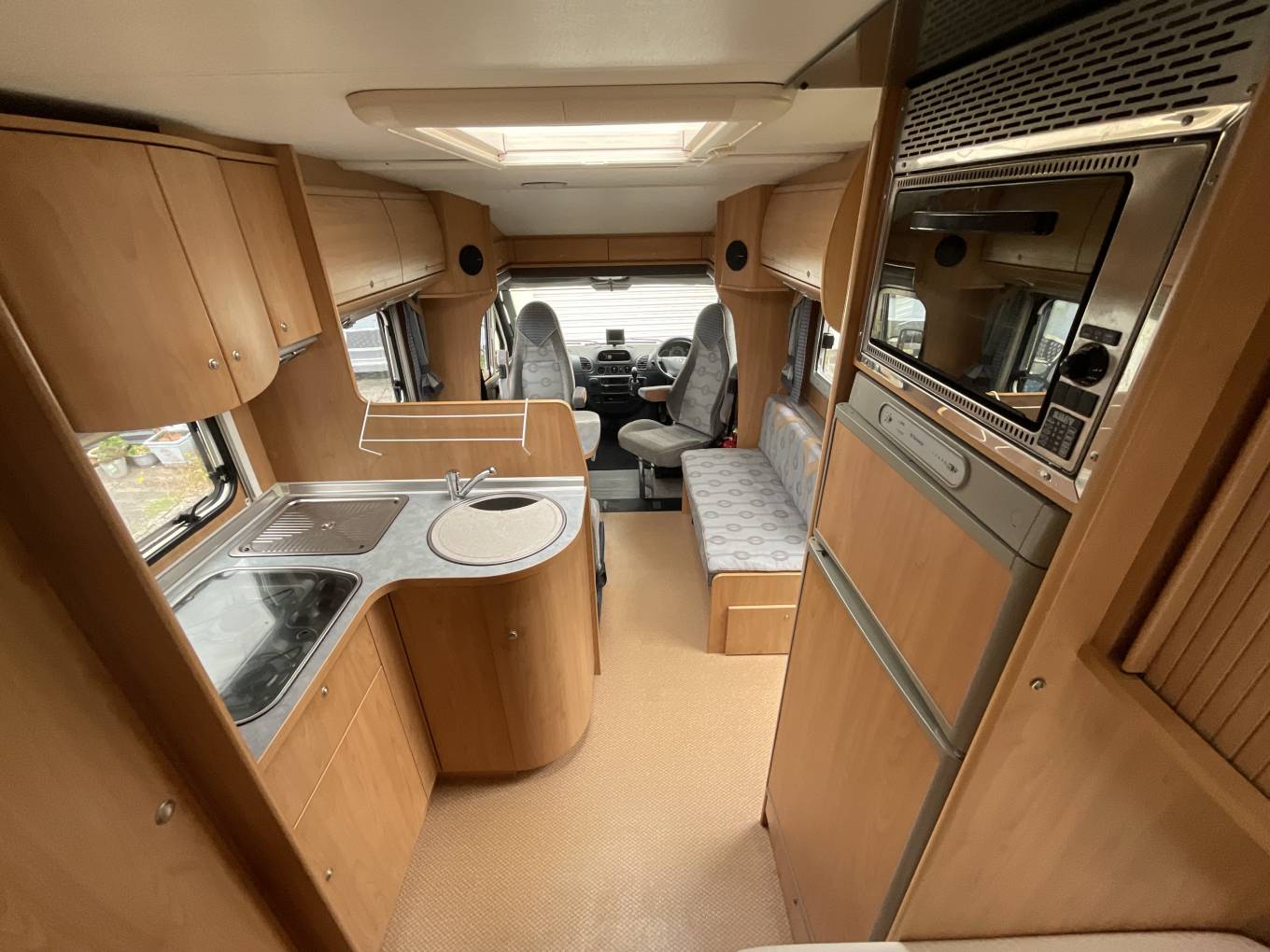 The kitchen is more than adequately equipped with eye level Smev oven and grill, large Dometic fridge with separate freezer, 3 ring gas hob and again a host of cleverly designed storage lockers. Behind the driver/passenger seats we have a large extendable table in the centre of the seating area which has two forward facing seats with full seat belts and a large side bench. Externally the motorhome has a solar panel, rear Fiamma ultra-box for storage, Omnistor wind out awning and a reversing camera.