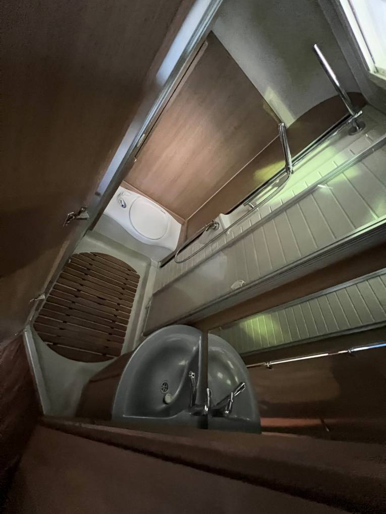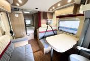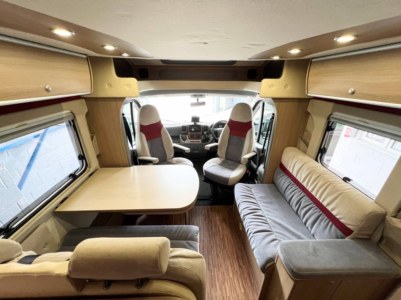 The washroom is cleverly designed with the bench Thetford cassette toilet to the rear and the vanity basin to the fore enabling the mid-section to be partitioned to enclose the shower. Dining and lounging has many options with the ability extend the table and rotate both cab seats.