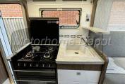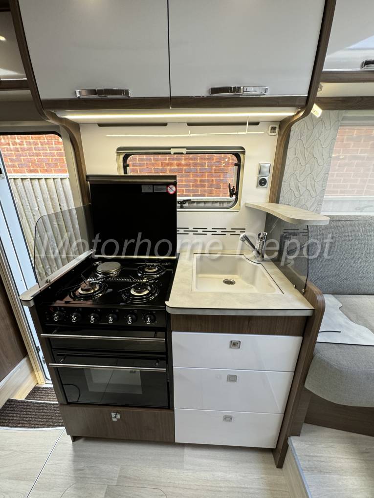 We enter the motorhome on the drivers side immediately opposite is a large wardrobe with fixings for the bed support. The Kitchen area immediately to the left consists of a Full size Dometic oven & hob. It has four burners, 3 gas & one electric for when you are plugged in to the mains on site. To the right is a good sized oblong sink with chrome mixer tap that extends as a rinsing aid. There are plenty of cupboards and drawers for all your cooking utensils. Opposite is a large absorber style Dometic fridge with separate freezer compartment, this can be operated in fully automatic mode so will switch between Gas; 12v and 240v depending on whether you are wild camping or plugged in on site. Above the fridge is a full size Rusell Hobbs microwave oven.
