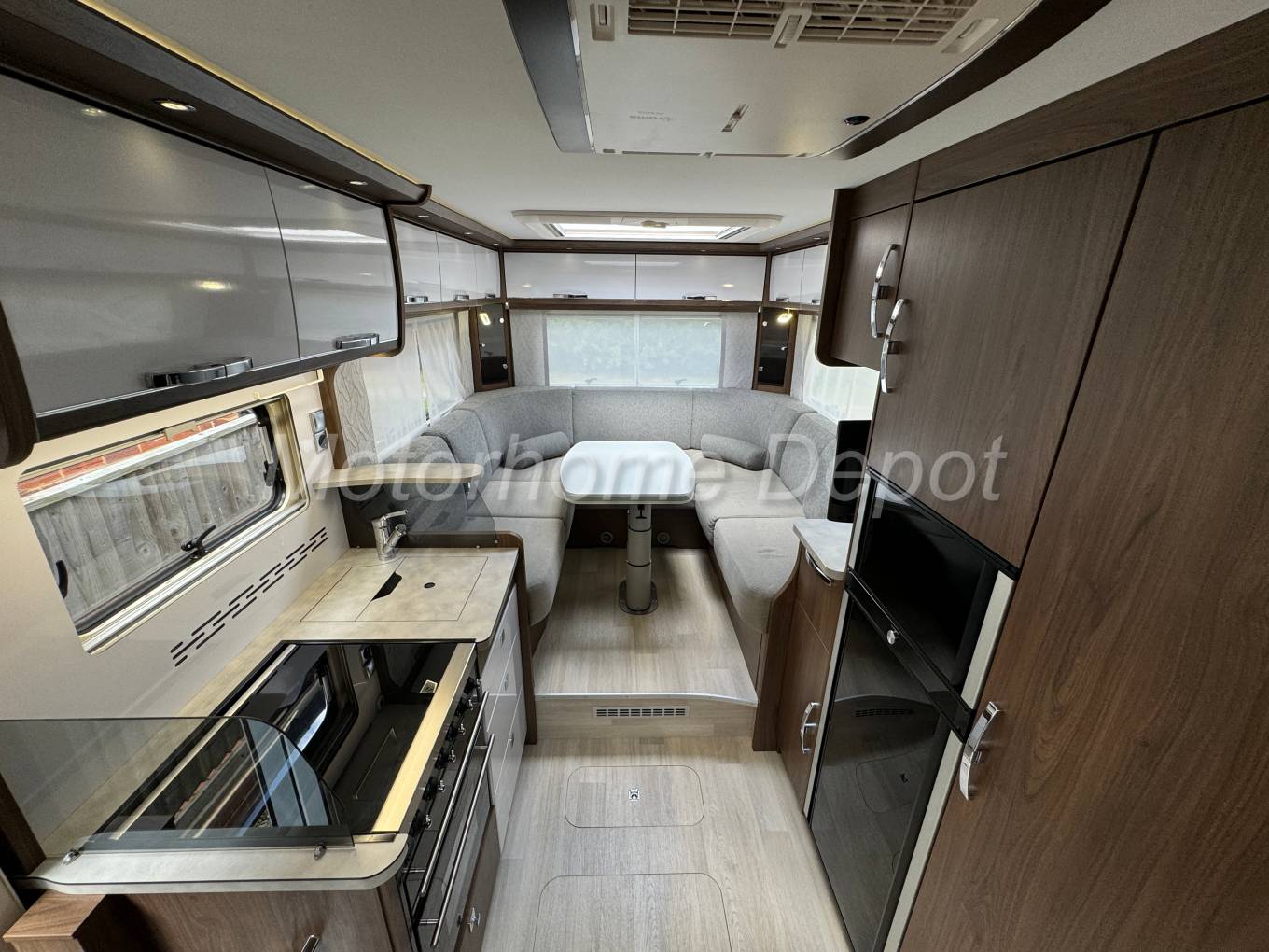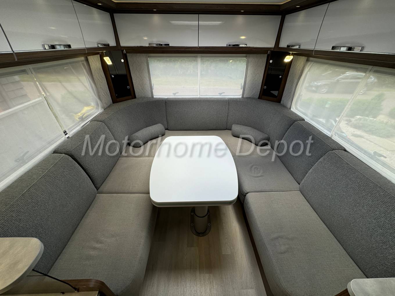 To the rear is the the massive U shaped lounge, perfect for reclining to watch the Avtex TV, or seating up to 8 people for dinner round the fixed table. The side sofas can be used as single beds if you have guests staying or alternatively you can drop the table to make a large double bed using a combination os sofa cushions as the mattress. There are foldable travelling seats underneath with 3 point seat belts. The whole area is flooded with light from its triple aspect windows.