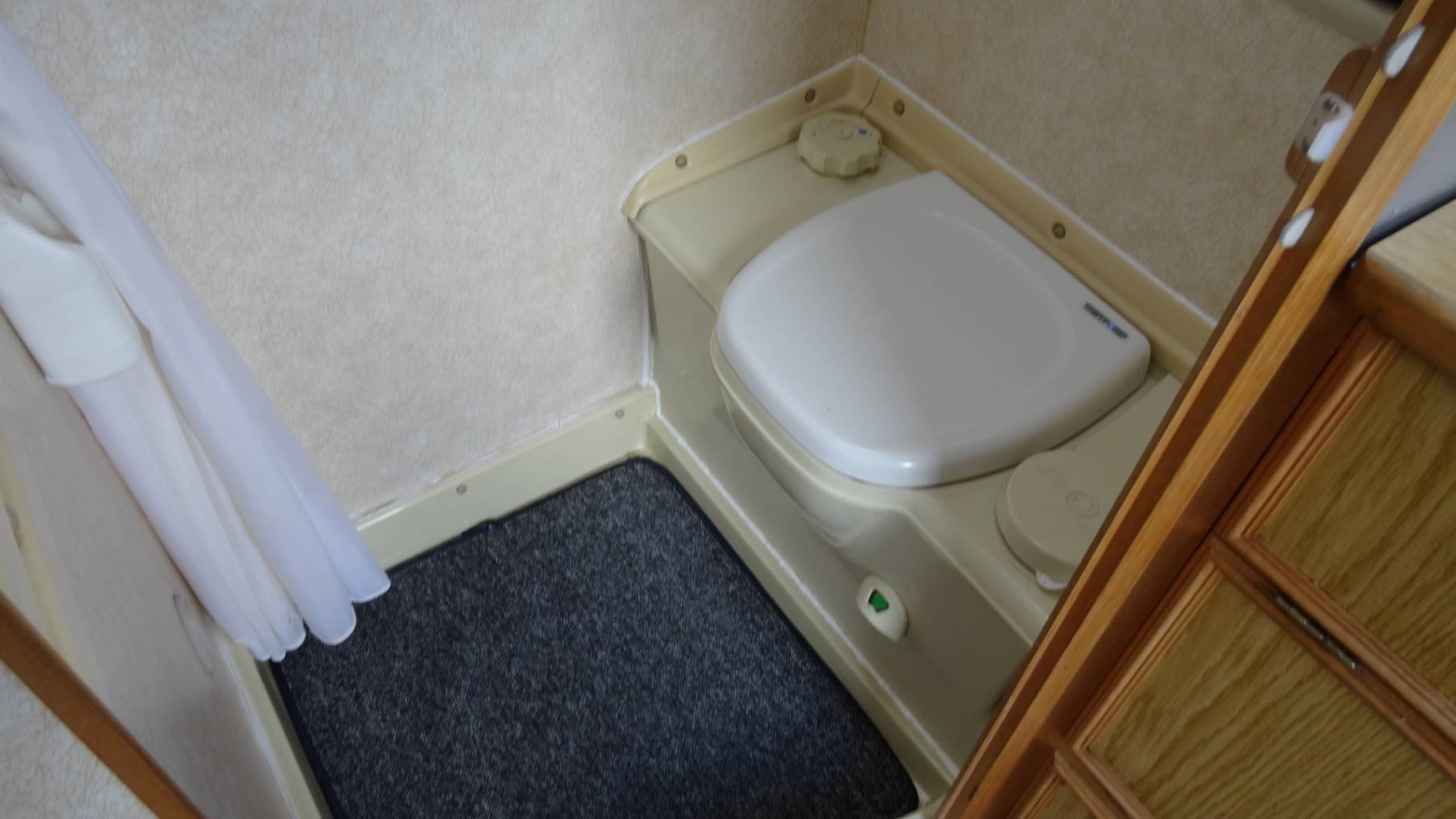heater set below, a washroom with cassette toilet, tip-up washbasin and shower