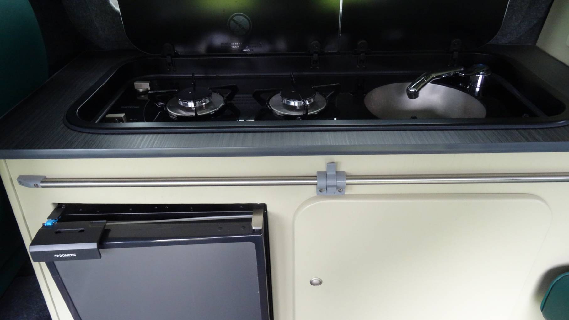 gas hob, sink and Dometic fridge.