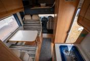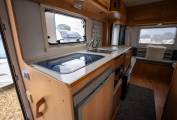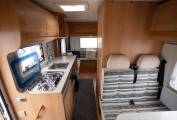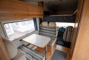 This motorhome comes with plenty of storage space, provided in overhead lockers, wardrobes and cabinets throughout. The large classic U-shaped lounge in the back, has a detachable table to make a lovely communal dining area, whilst the alternative centre dinette area can easily accommodate another 4 people. In the kitchen area we have 3 gas hobs, a combi SMEV Oven/Grill system and plenty of worktop space. Below is a Dometic 3 Way Fridge with Freezer compartment and the classic Trumatic Heater.