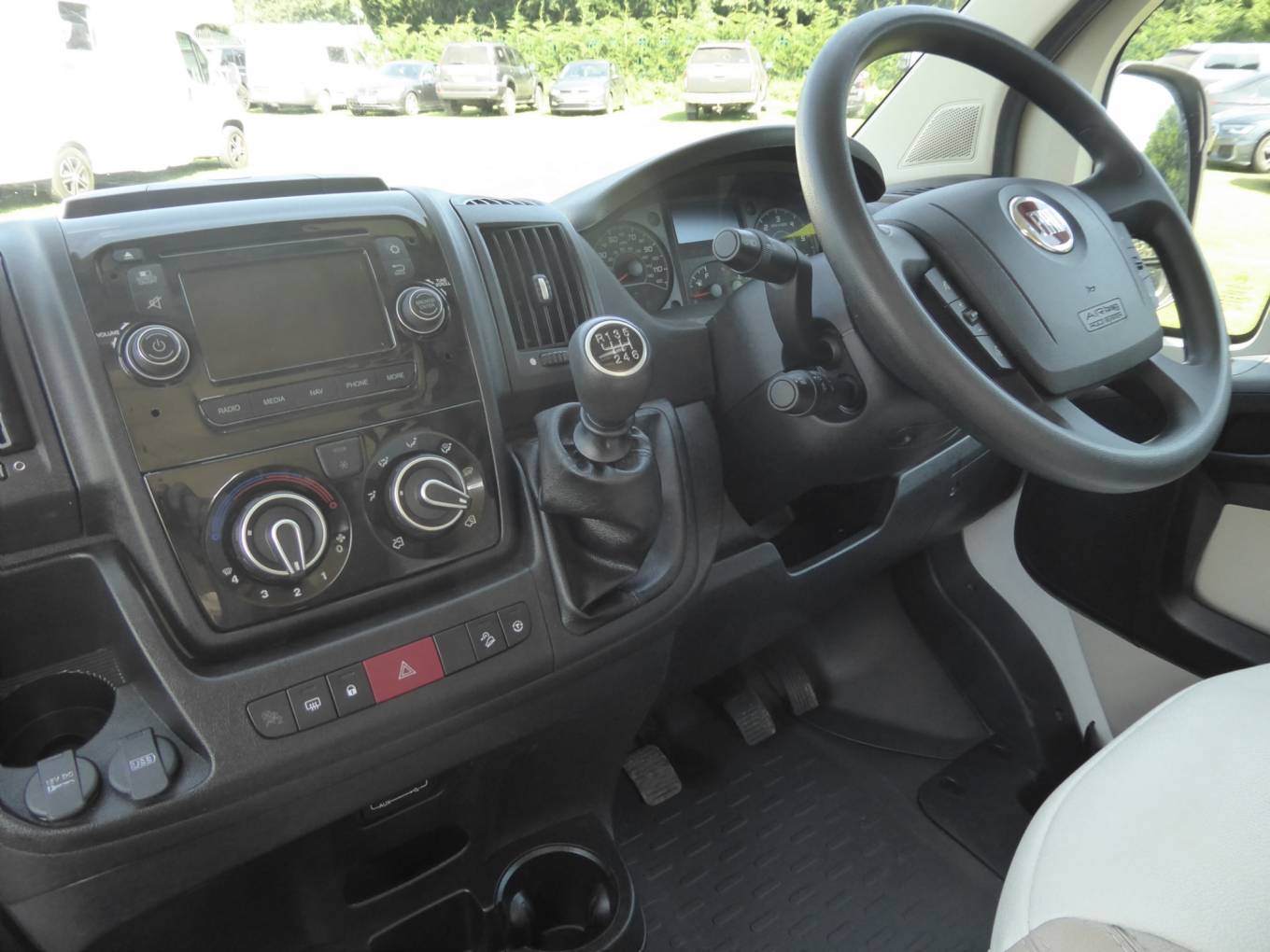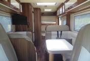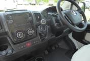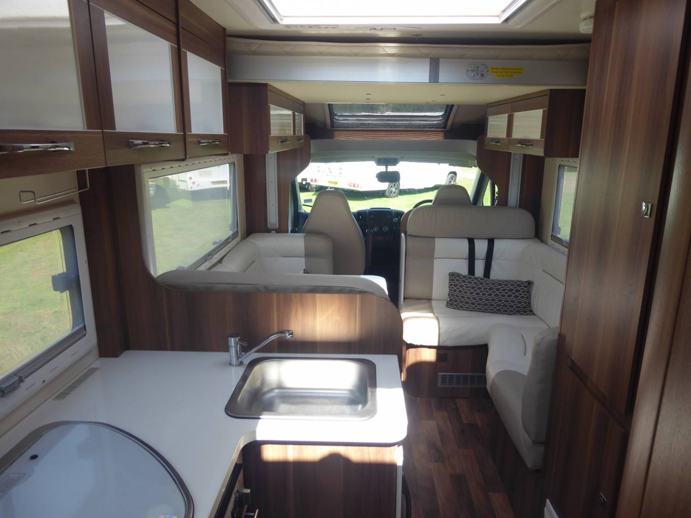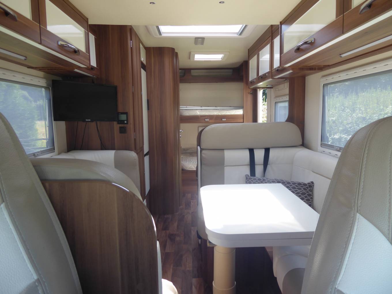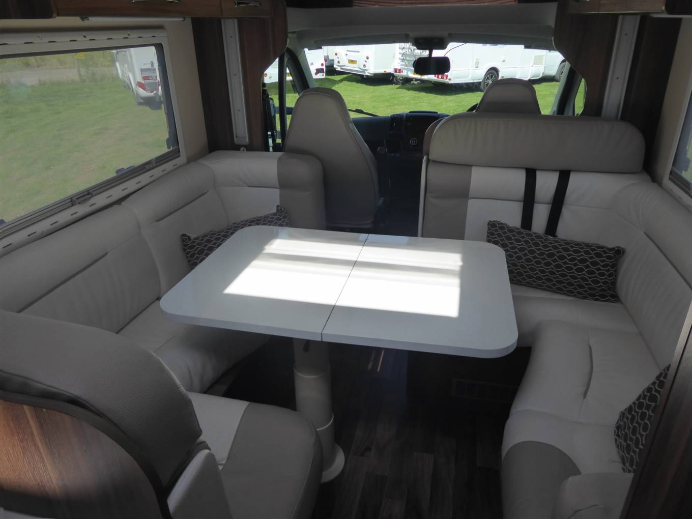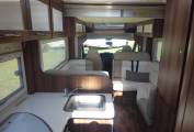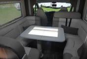 Behind the cab is a large leisure/dining area comprised of two opposing L-shaped seating sofas around a folding table, with two forward facing seat belts on the nearside and two rear-facing seat belts on the offside. This seating can be reconfigured into a large double berth (or even used as a triple), but is more readily usable as two singles.