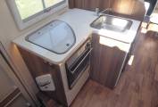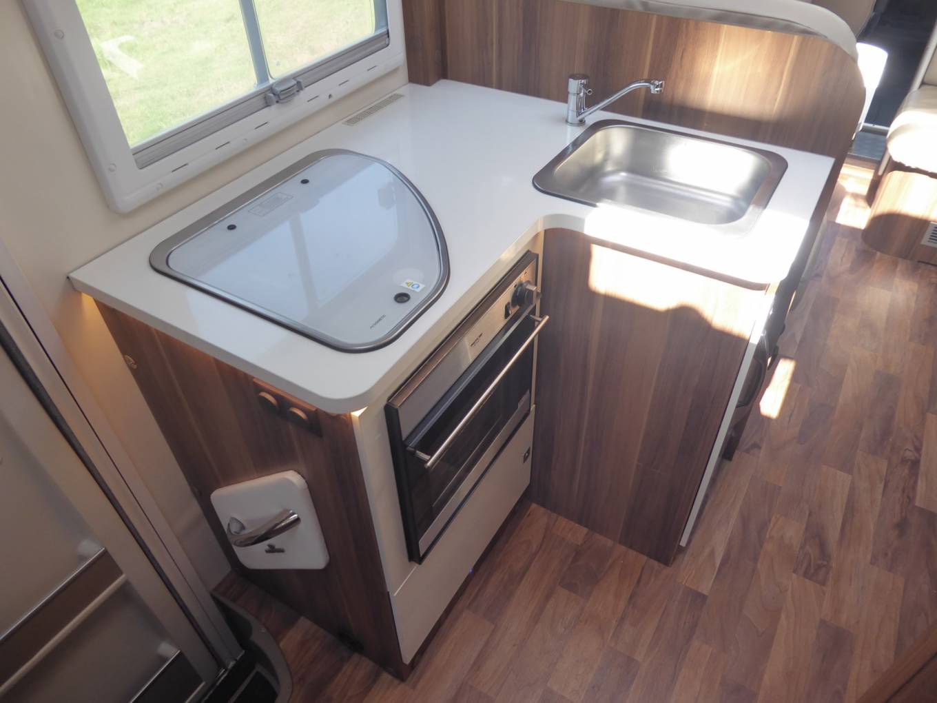 Progressing through the vehicle there is a kitchen area with a nearside hob with three gas burners, a combination oven/grill, and a sink, beyond which lies the habitation door. On the offside is a large fridge and freezer box, as well as a wardrobe.