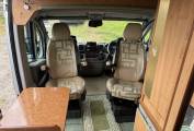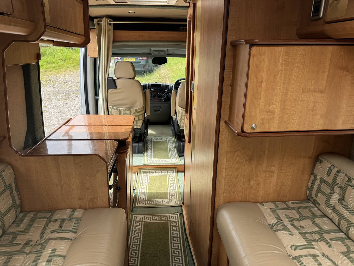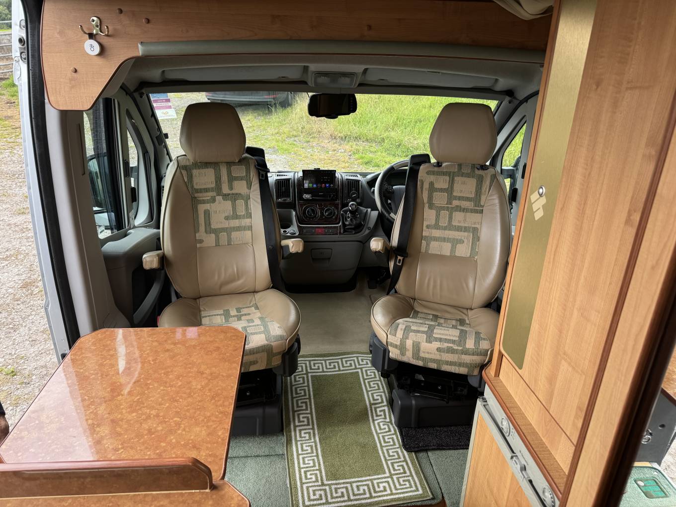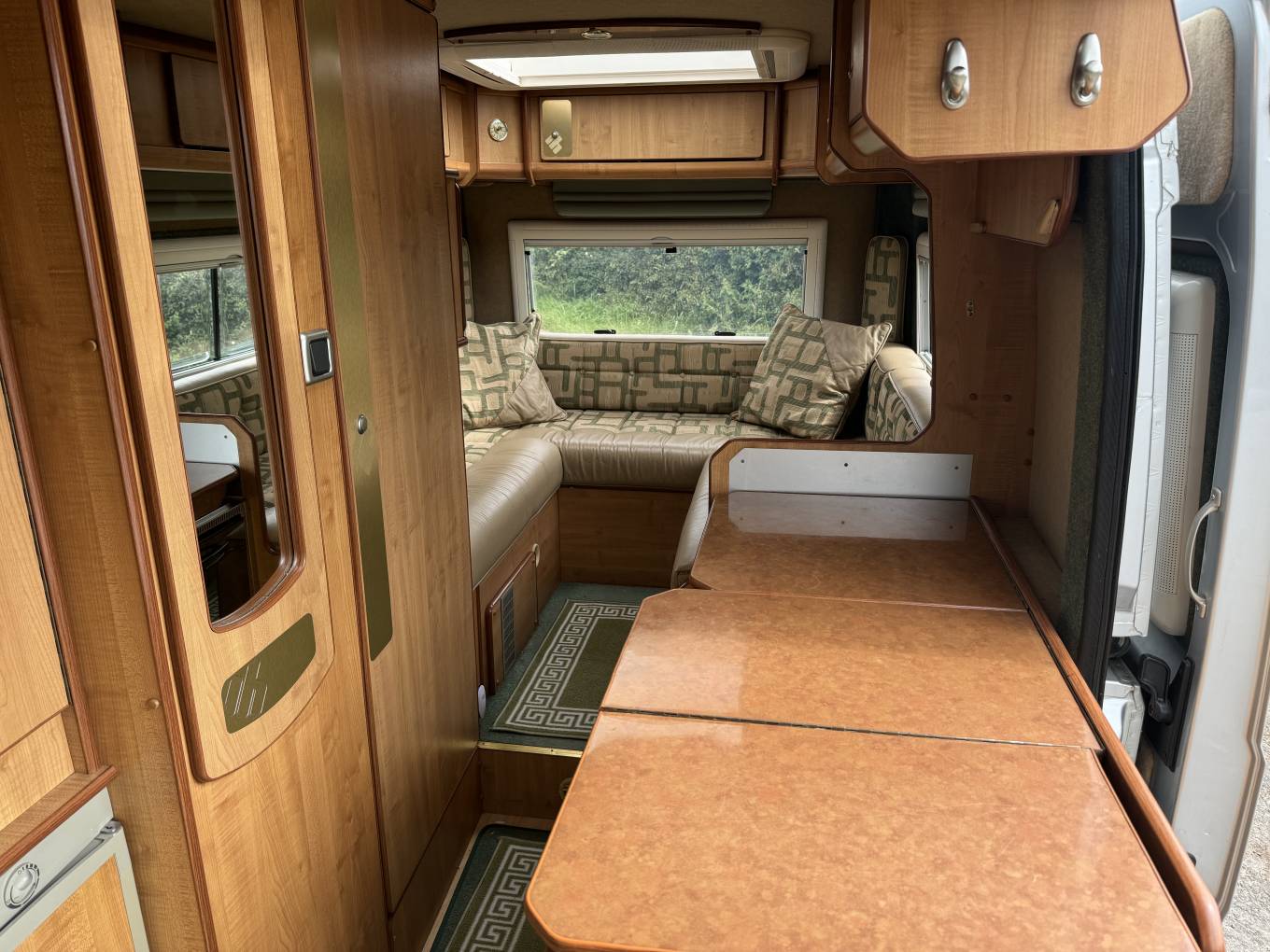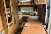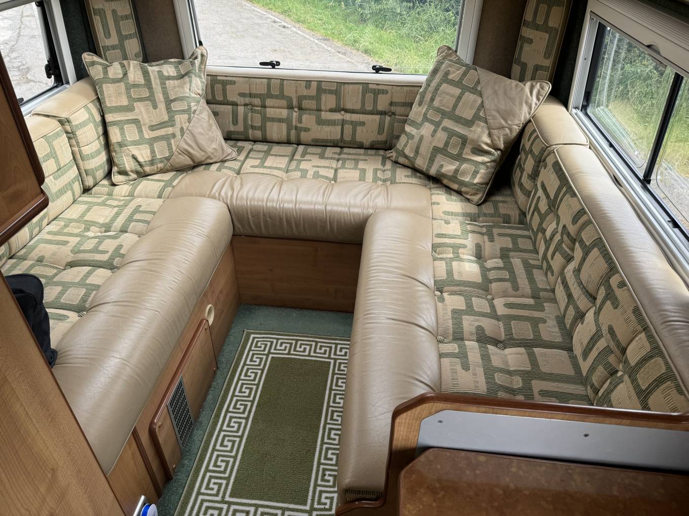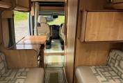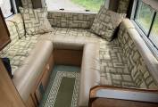 The layout includes a rear U-shaped lounge with an over-cab bed. The rear lounge area, with its light and cheerful fabric, large windows, and roof lights, is flooded with natural light, making it a fabulous spot to relax and unwind. There is also a TV point next to the main control panel. The sofas convert into an extremely large king-size bed.