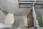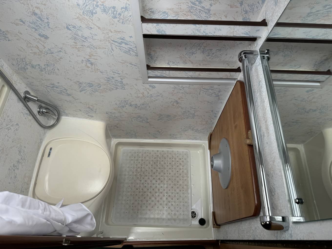 Opposite the kitchen is the spacious washroom, which includes a shower, a Thetford toilet cassette, a washbasin with a mixer tap, and a full-size wardrobe with drawers and cupboards.