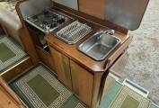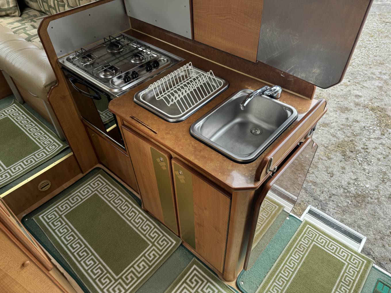 As we move through the motorhome, we find the kitchen, equipped with an oven with grill, a 4-burner gas hob, a stainless steel sink with overhead storage, and a Dometic 3-way fridge with a freezer compartment.