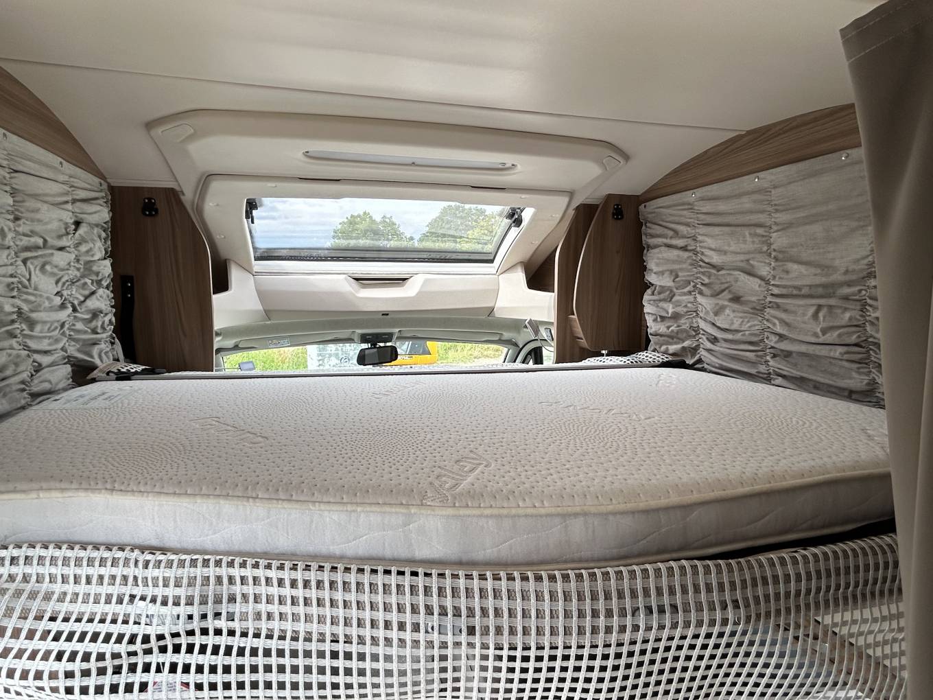 The rear U shape lounge is very spacious and is a great spot to relax after a day out. The triple aspect windows and large skylight let in plenty of natural light. The sofas are long enough to use as 2 single beds or the sofas can be pulled together to make a kingsize bed. The final 2 sleeping berths are in the drop down bed above the front lounge.