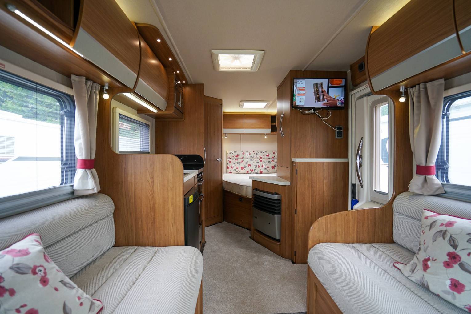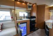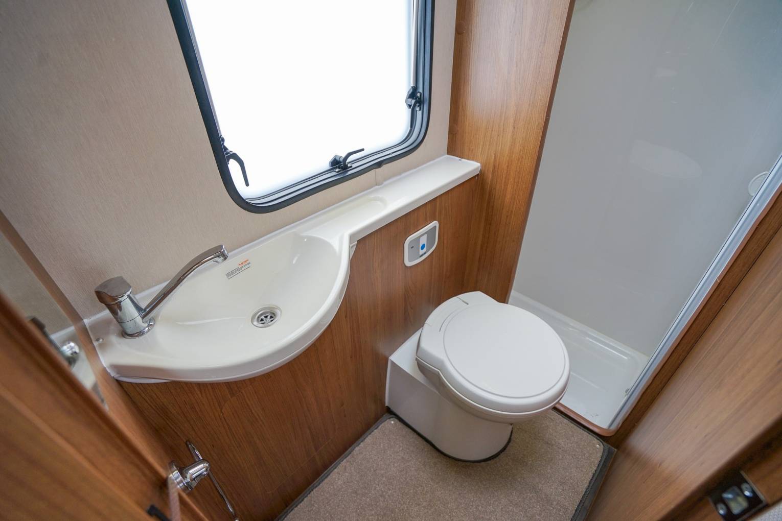 There is a good sized washroom with Thetford flush cassette toilet, vanity sink