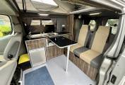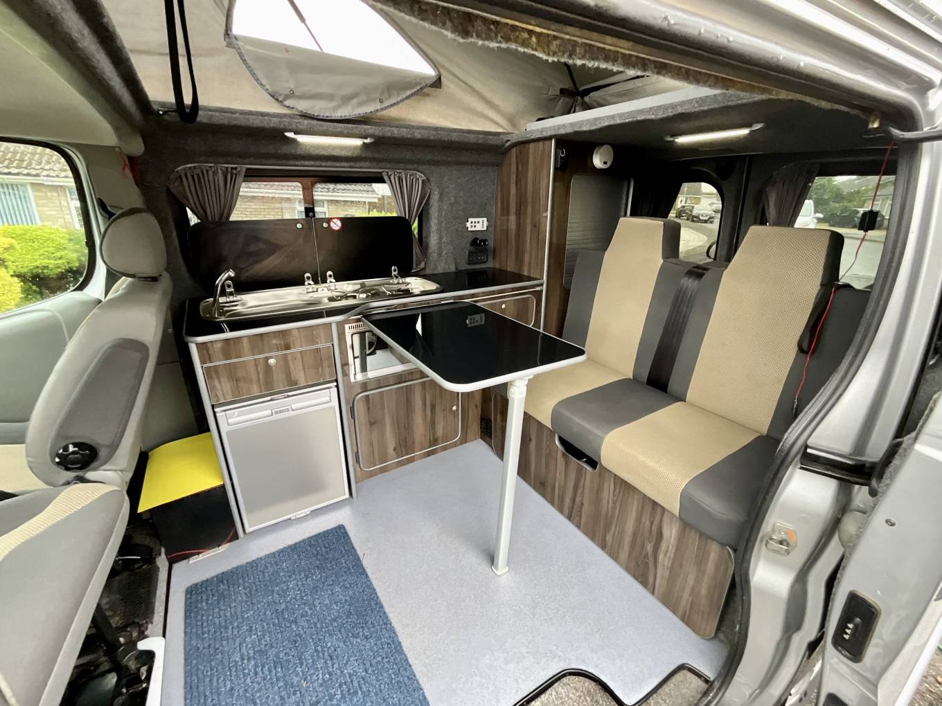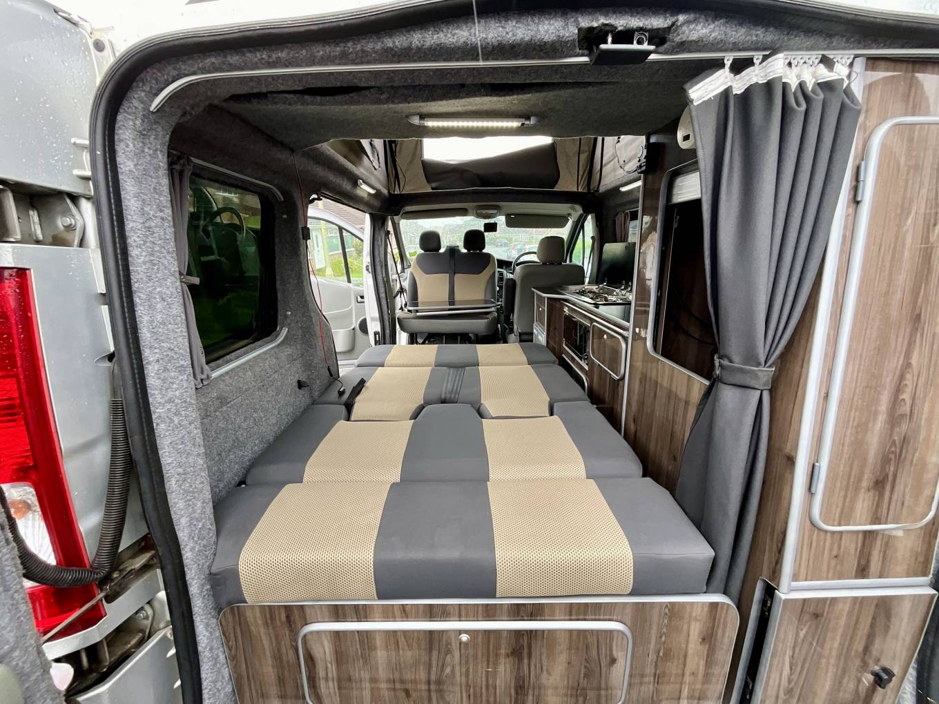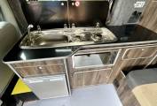 The kitchen is fully equipped with two gas hobs, grill, sink with water pump, storage and fridge with freezer. Light strips are fitted throughout the campervan.