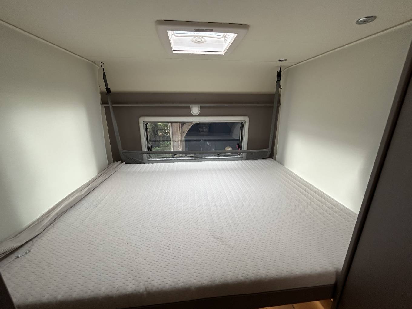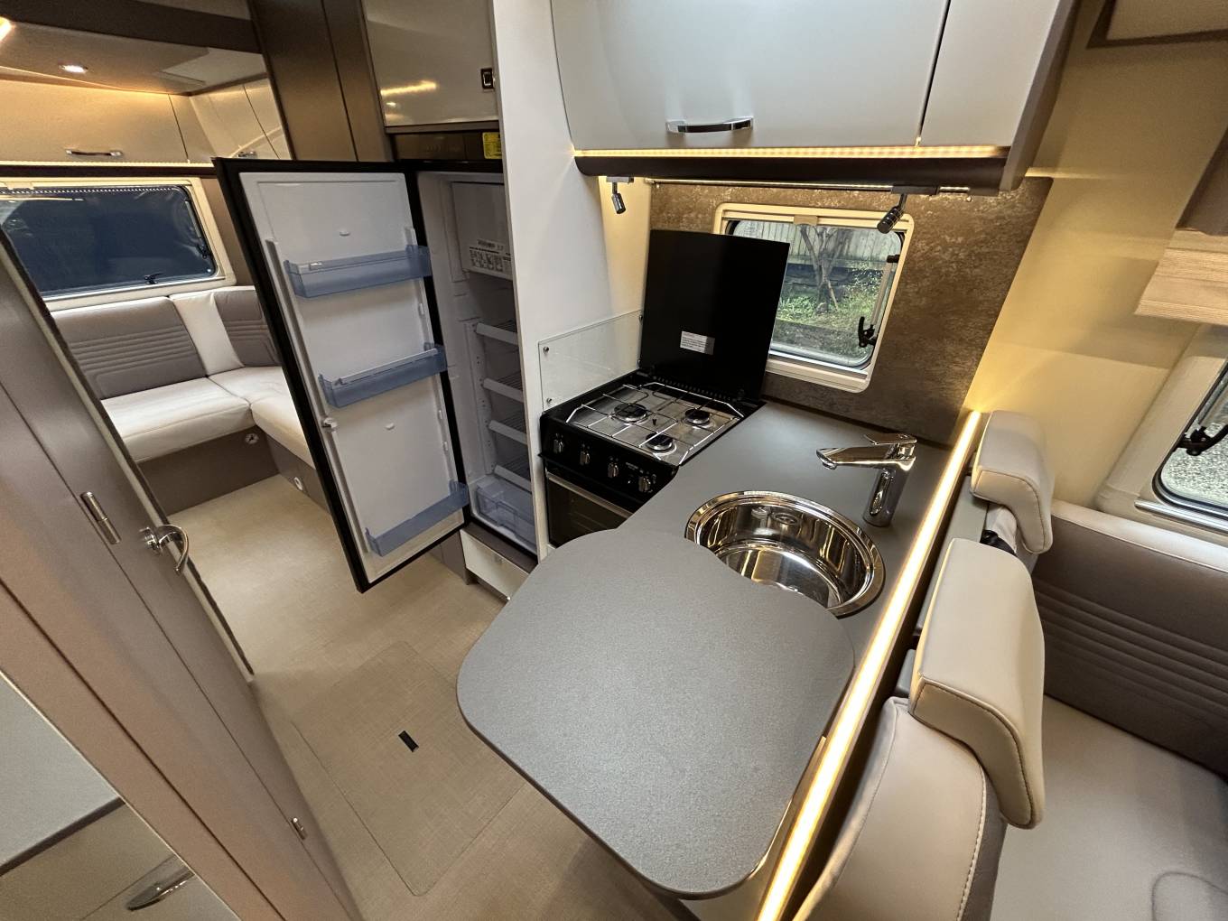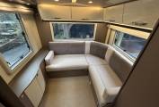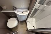 Layout - Starting at the rear you have a large/spacious L shaped lounge. Above this area you have the first of two electric large drop down beds. In front of the lounge area you will find the washroom which has everything you need including separate shower cubicle, wash basin, toilet cassette, vanity mirror and storage. The kitchen area is mid habitation and includes a modern three way fridge with freezer space, sink with hot and cold mixer tap, 3 gas rings and an oven/grill combi and more storage.