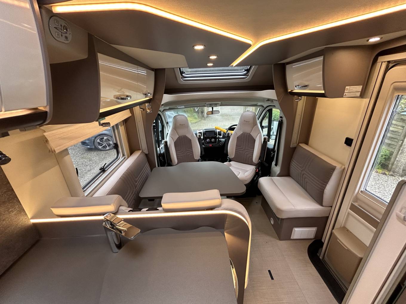 Moving forward you have the centre dinette area which allows you to travel 2 extra people and offers another area to relax. This area can be turned into a four-seater dinette area when you take advantage of the front swivel seats. Above here is where you will find your second electric drop down double bed . The cab area is where you will find comfort and a host of extras which all help make this motorhome a safe and comfortable drive. You also have a garage at the rear of the motorhome that runs across the rear.