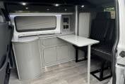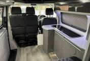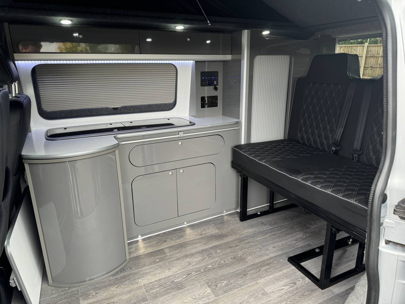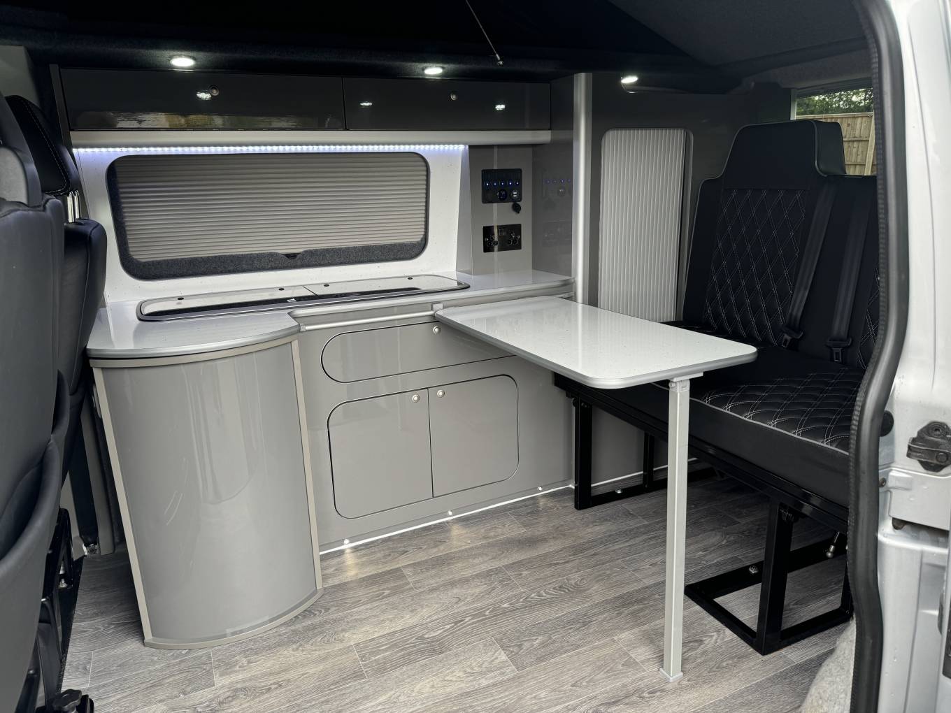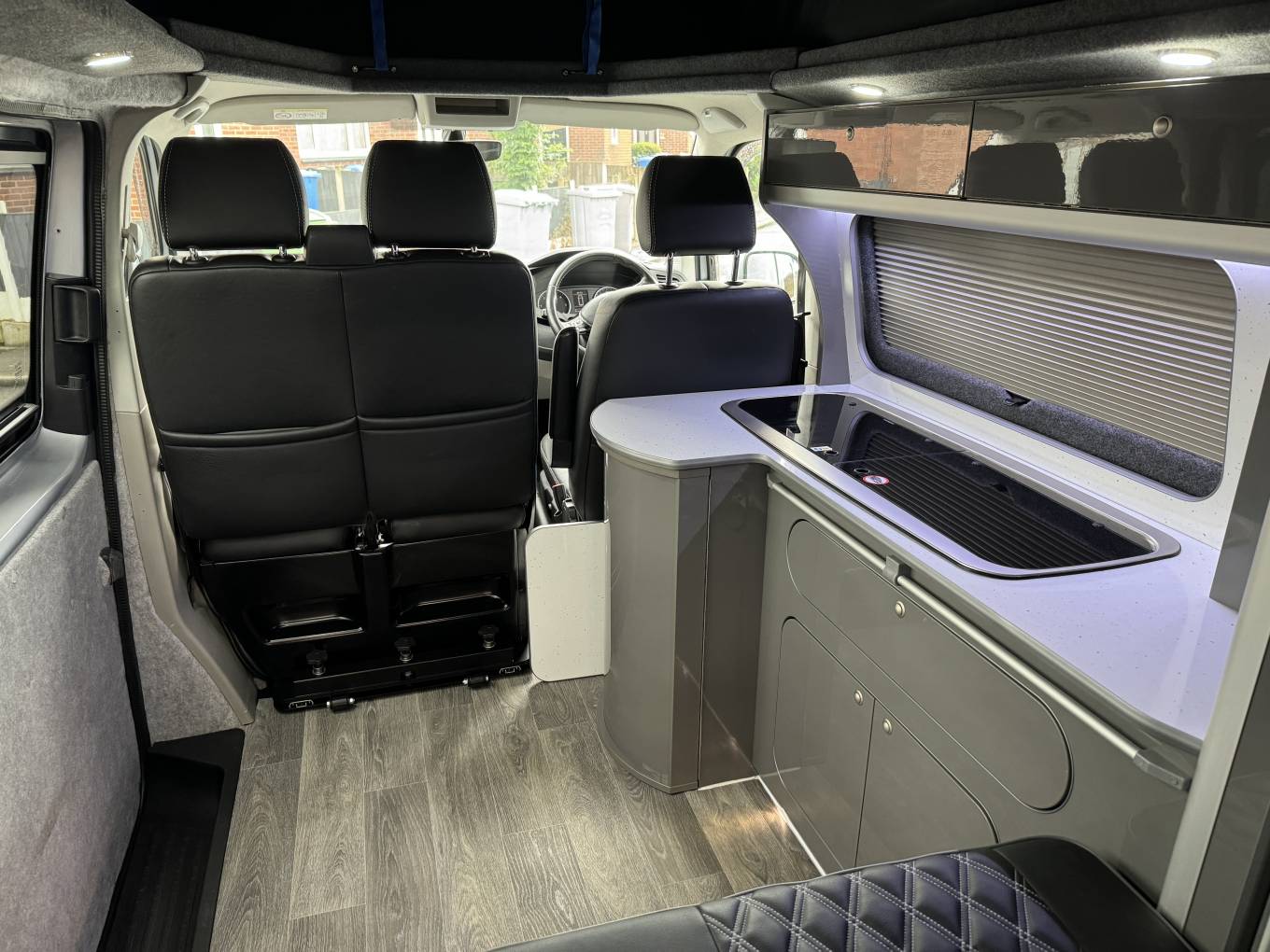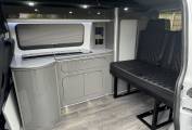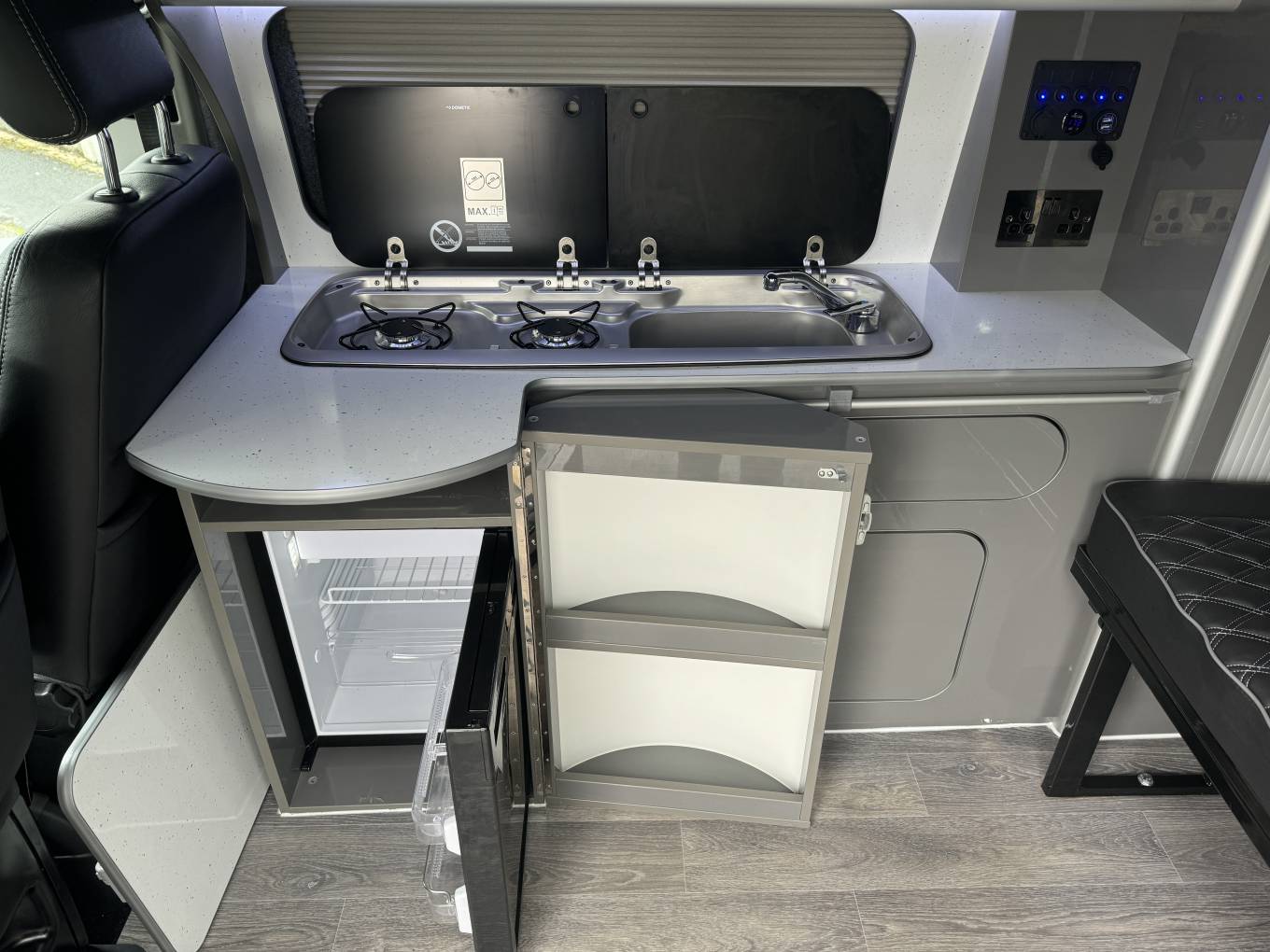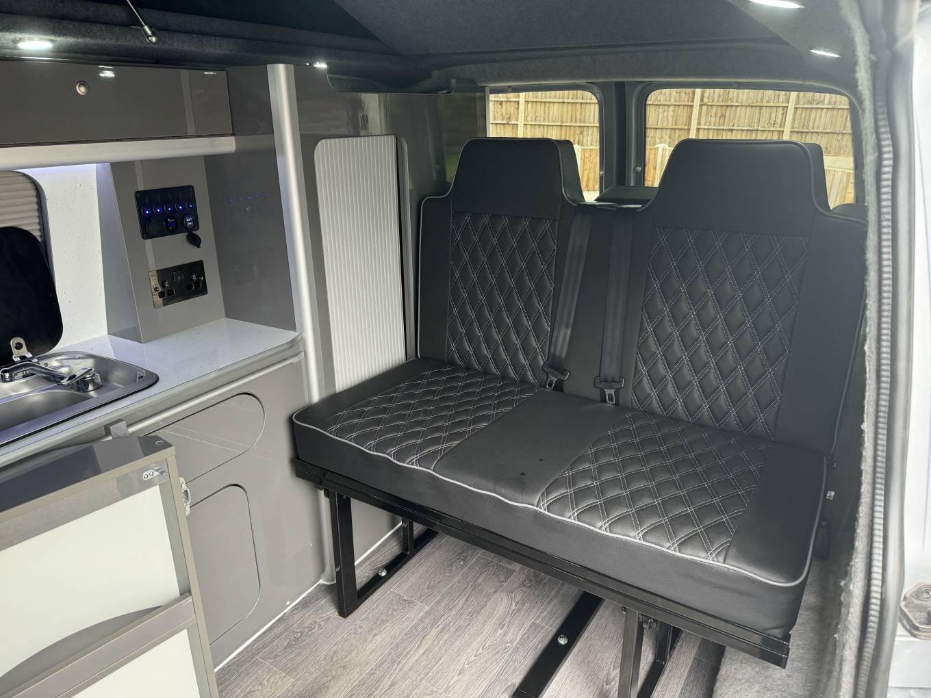 This high level quality conversion offers a 4 berth sleeping capacity along with 5 travelling seats. The cab which boasts 3 of the 2 travelling seats also has the 2 swivel chairs that can be turned around using the swivel plate to face the centre dinette and the remaining 2 travelling seats. These seats are also able to slide forwards and backwards to give you more space when turning. In the Cab there is a touch screen interface which includes radio, bluetooth phone and A/C and. There is also a heated front windscreen which is ideal for the winter frosty mornings.