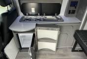 The centre dinette includes 2 ring gas hob, stainless steel sink and a good sized fridge with freezer compartment. In this area, there is a removable dining table which is positioned between the 5 travelling seats. .