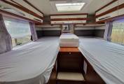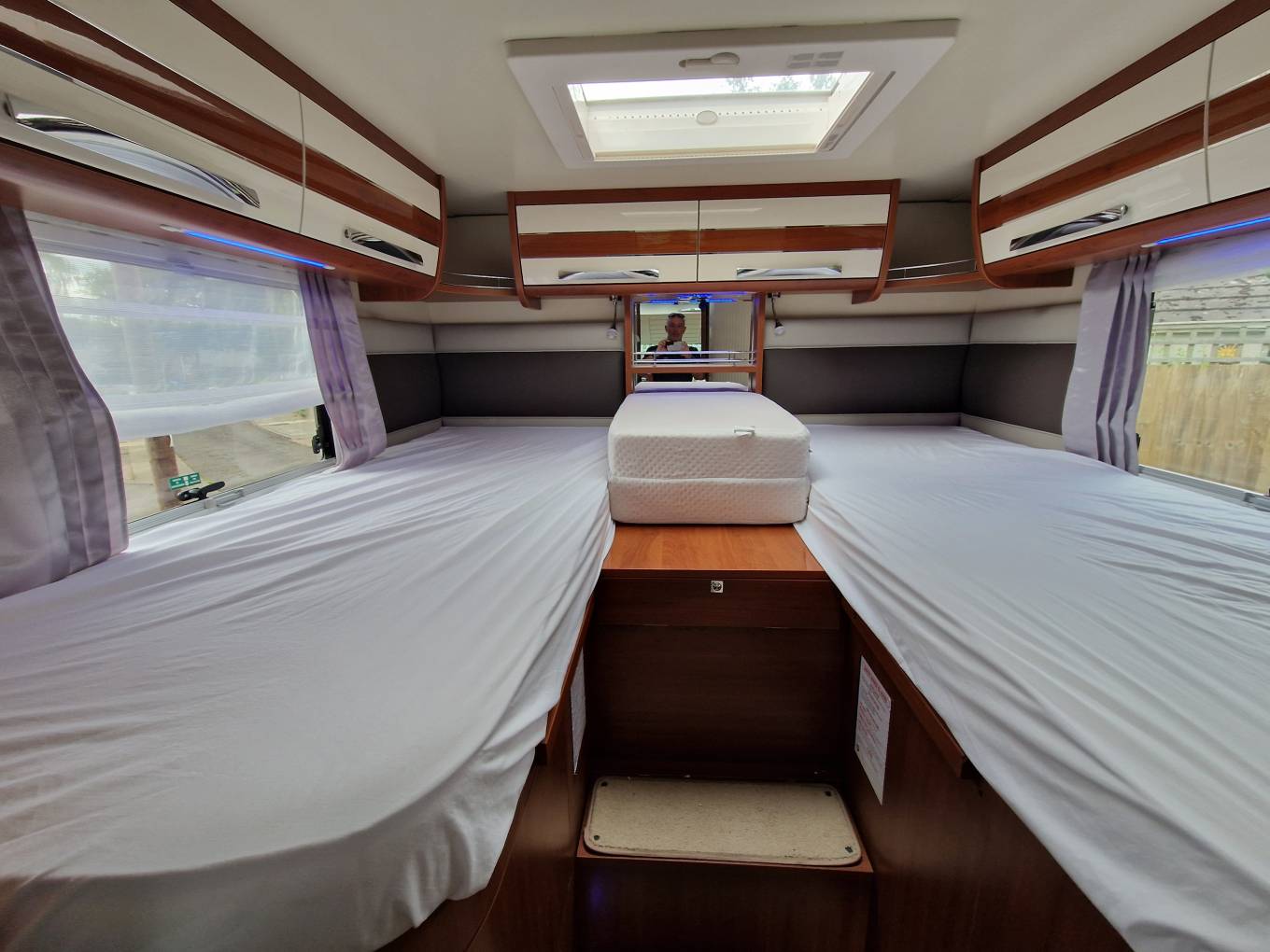 At the rear, two steps lead up to the high-level permanent single beds with a mirror between their headboards. The twin beds have lengths of 1.92m and 2.05m, with identical widths of 0.82m.