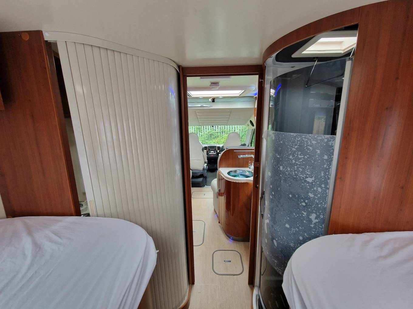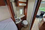 The layout is one of the most popular in this size of vehicle today and offers four berths (including the typical A-class drop-down bed in the cab), as well as four belted travel seats. The en suite washroom at the foot of the single beds has a shower (with frosted door and duckboard) on the offside and toilet room on the nearside, while this area can be shut off from the front of the motorhome with a solid door. The toilet area comes with toothbrush and soap holders, towel rail, toilet roll holder and brush and a Mini Heki with extractor fan.