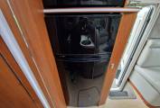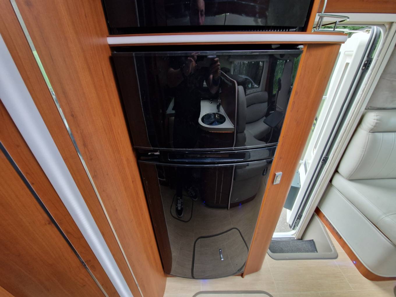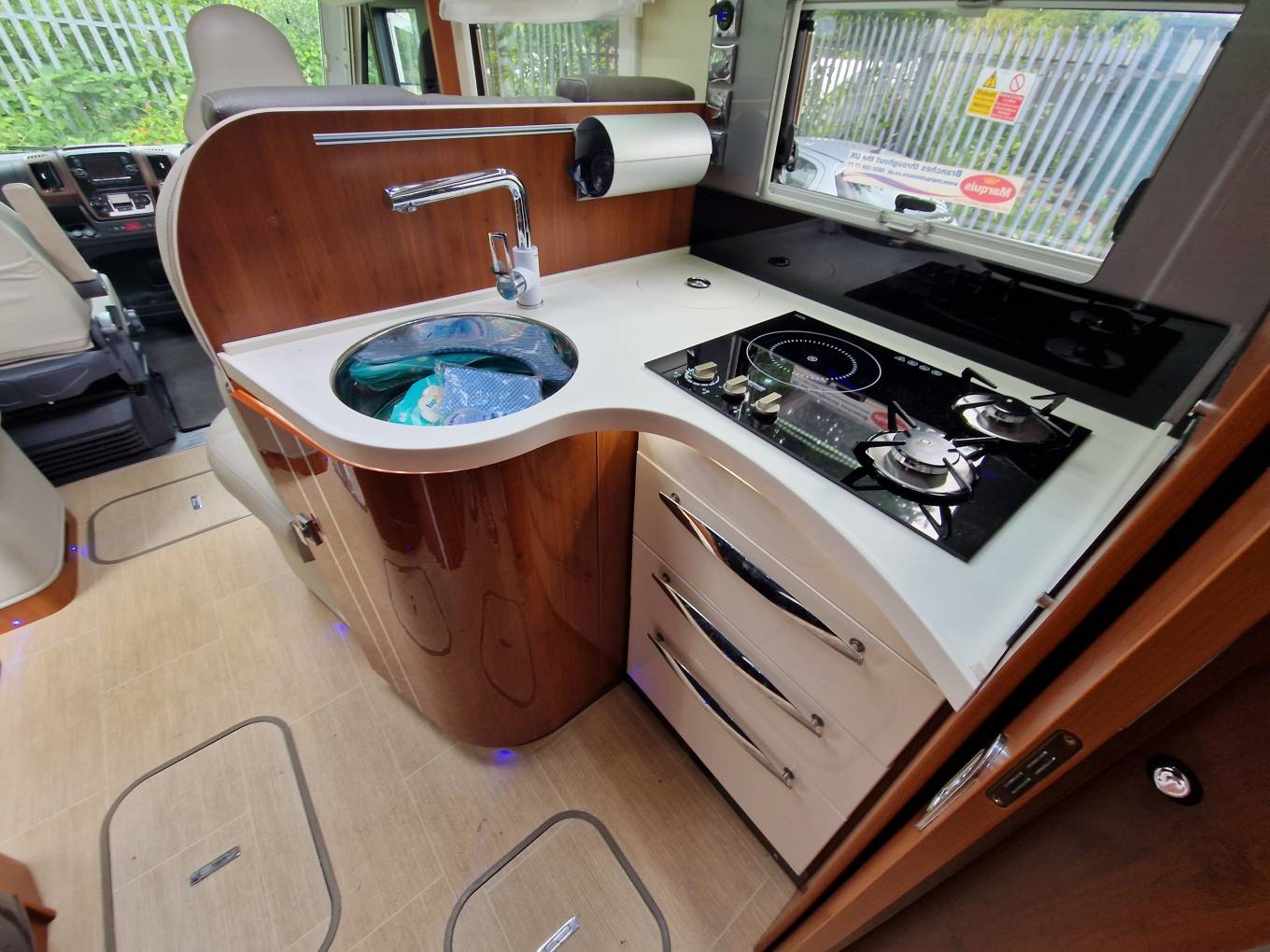 The L-shaped kitchen looks very good with its curvy worktop shape and there’s a three-burner hob, chrome sink with mixer tap and a multi-function chopping board. On the opposite side of the motorhome is a 150-litre, two-door fridge/freezer with a small oven/grill mounted above. Also here is a slide-out larder-style unit for storage of tinned foods and the like.