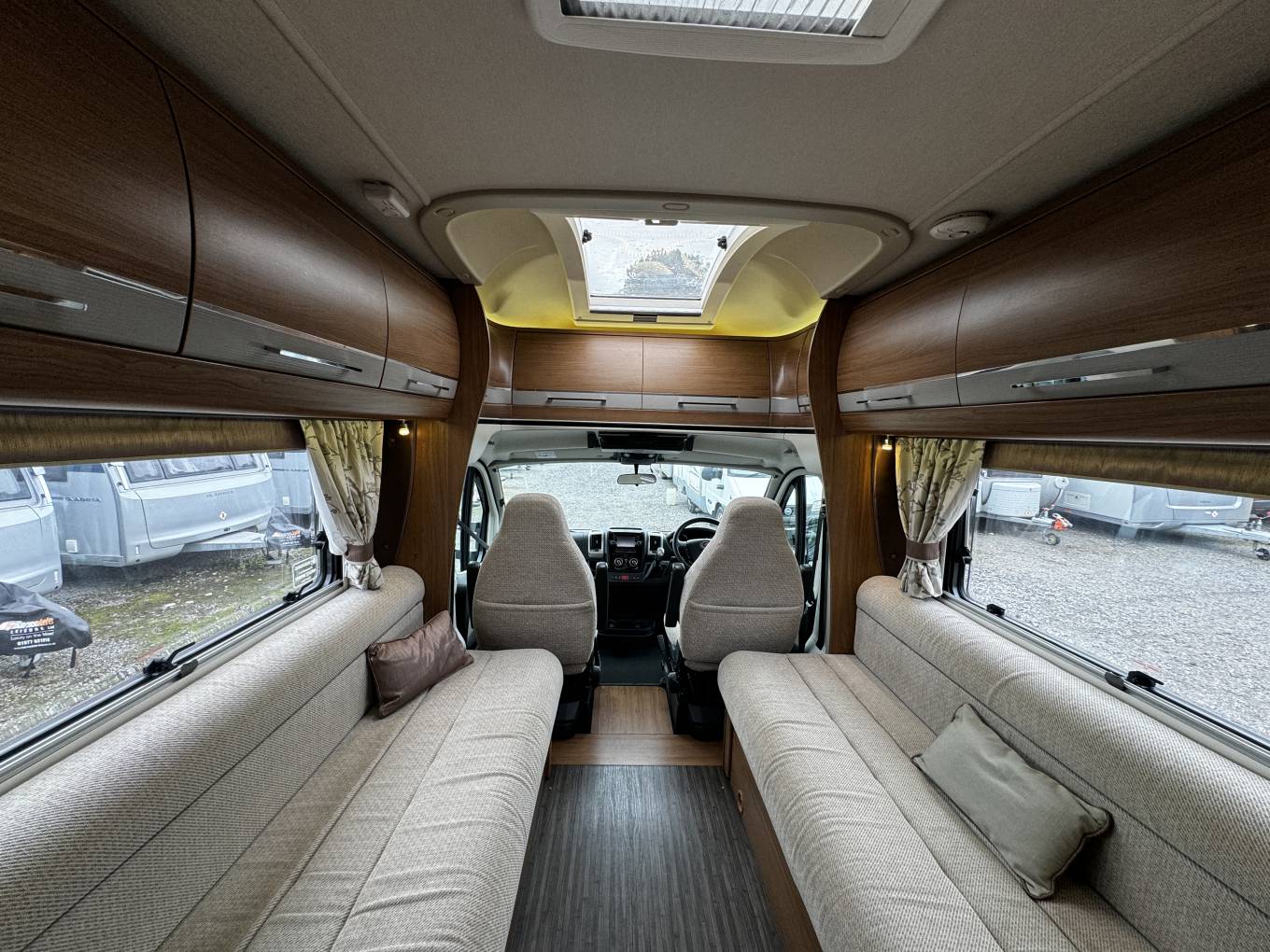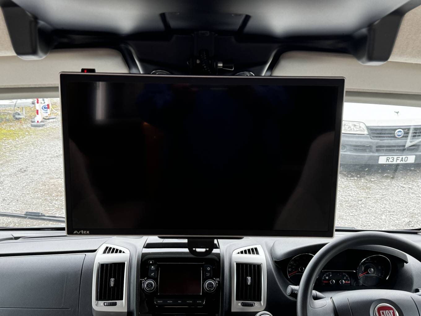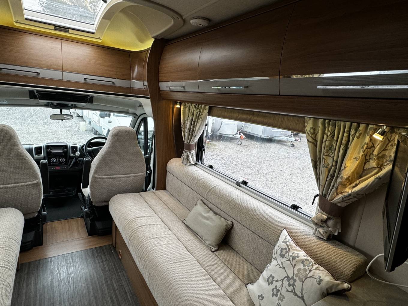 To the interior we have the Truma Gas & Electric blown air heating. Remis blinds to cab windows ,Entertainment system featuring with 15 inch Drop down Avtex TV monitor, built 7 inch Touch screen radio, CD, DVD player, a second Avtex TV in the lounge radio Digital Receiver, reversing camera. End Kitchen with Full cooker, oven, Grill and dual fuel hob, stainless steel, microwave oven and sink with draining area, 3 way Fridge with freezer, Locking soft close drawers, under counter lighting. Washroom with Separate Shower enclosure, Washbasin Vanity cabinet, mirror and cassette toilet. Two long comfortable side sofa’s which make up into a large double or two generous single beds. A large Foldable dining table and swivel captain’s chairs provide an ample dining area that could accommodate 6 people if required.