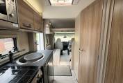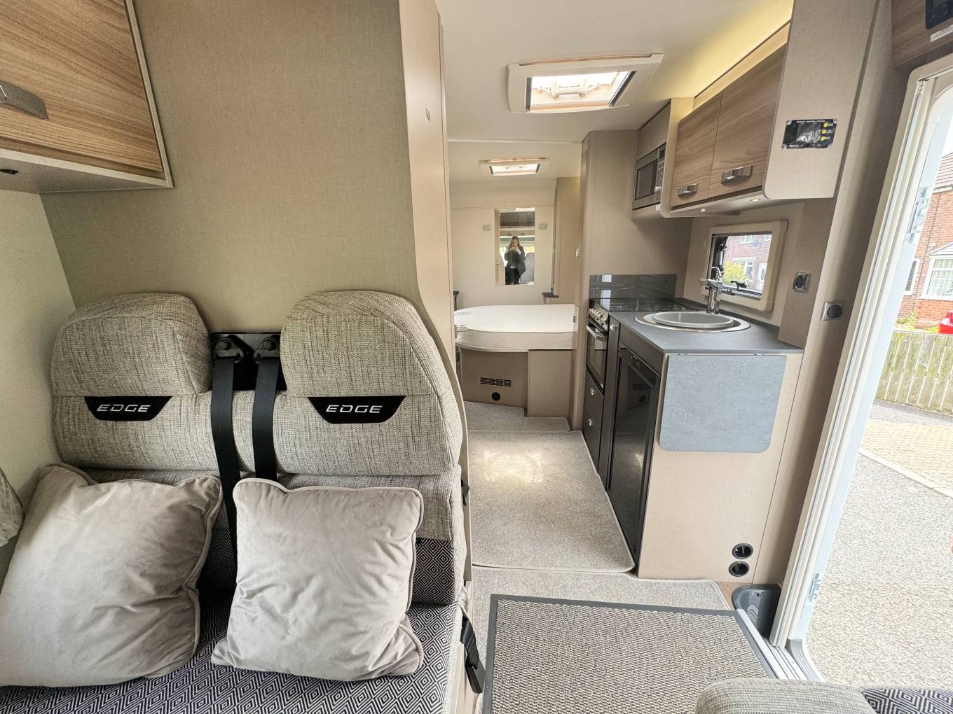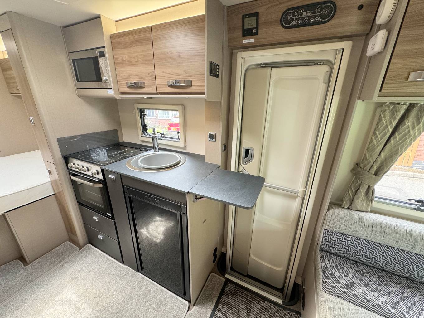 Next up you have the kitchen area this has everything needed on your ventures including, circular sink with mixer tap, oven with grill, 3 burner gas hob with an electric hot plate, fridge with freezer compartment, microwave and plenty of storage.