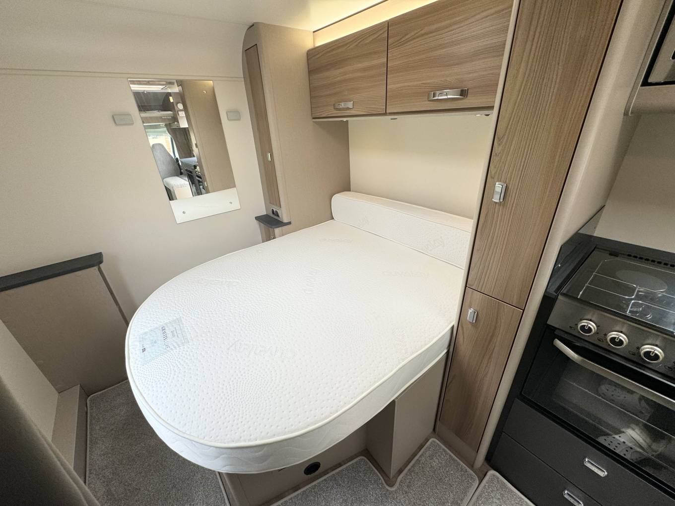 At the rear is the ever popular fixed island bed with plenty of room to manoeuvre either side, it has his & hers wardrobes and over head storage. If you have guests or children on your travels there is a curtain you can shut the rest of the cab off from the bedroom area giving you the privacy you require.