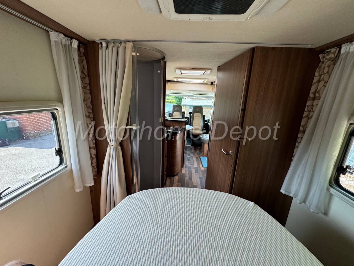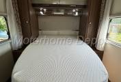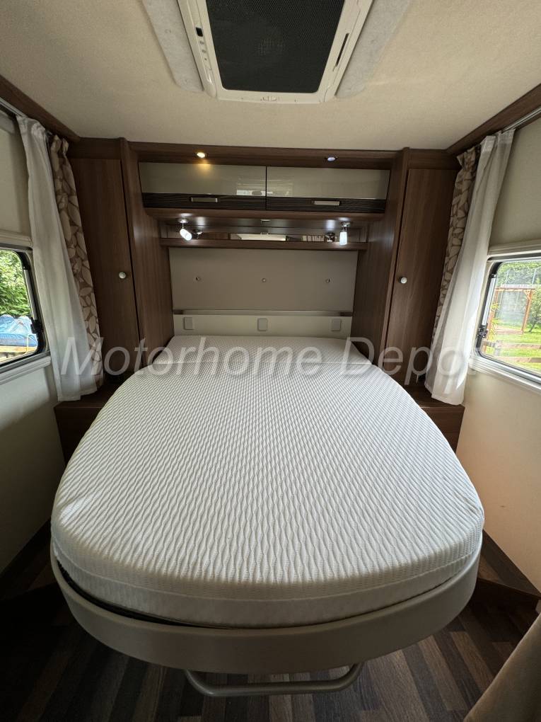 Finally to the rear is the large bedroom with reclining Island bed, half sized hanging wardrobes either side and storage at the foot of the bed.