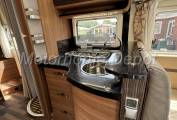 Moving rear the L shaped kitchen consists of: round sink with chrome mixer tap; 3 gas burner hob with hinged glass top; there is plenty of drawer & cupboard space above and below the counter for all your holiday provisions. Opposite is a Tec tower; a large 3 way fridge with separate freezer box that can be powered by 240v; 12v or gas depending whether you are plugged in on site or wild camping. The oven and grill is situated on top.