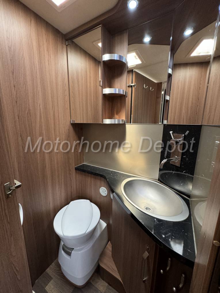 The bathroom is split with the toilet washroom on one side and a separate shower cubicle on the other. The door can close of the habitation area giving a private area to get dressed or close off the toilet area. This has a canny design that the wall can be extended to give extra space. The toilet is a Dometic cassette style with a swivel head and fresh water flush. Above is a built in sink with chrome mixer tap. The area gives a feeling of space with plenty of mirrors there is also plenty of cupboard space.