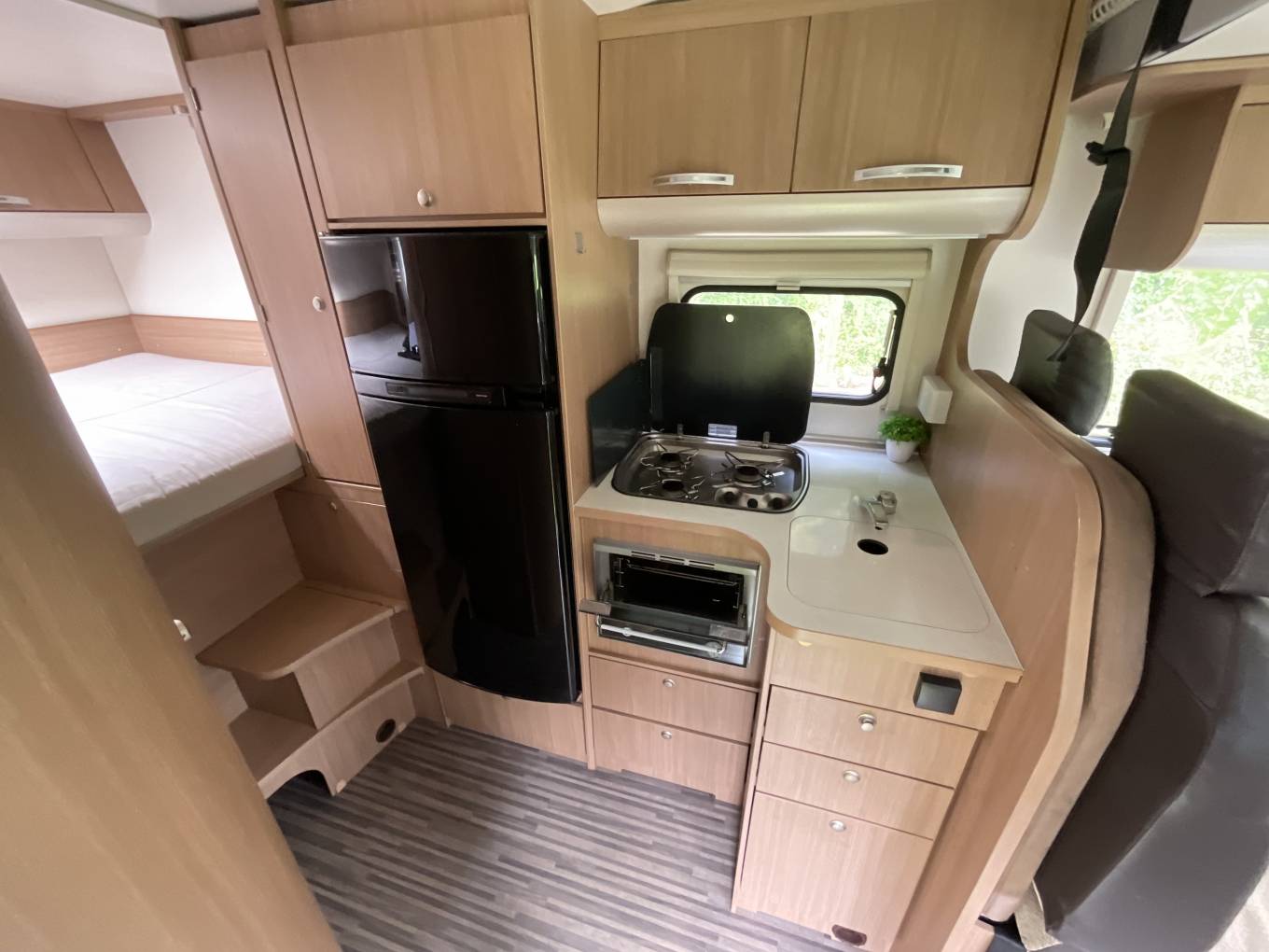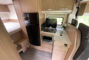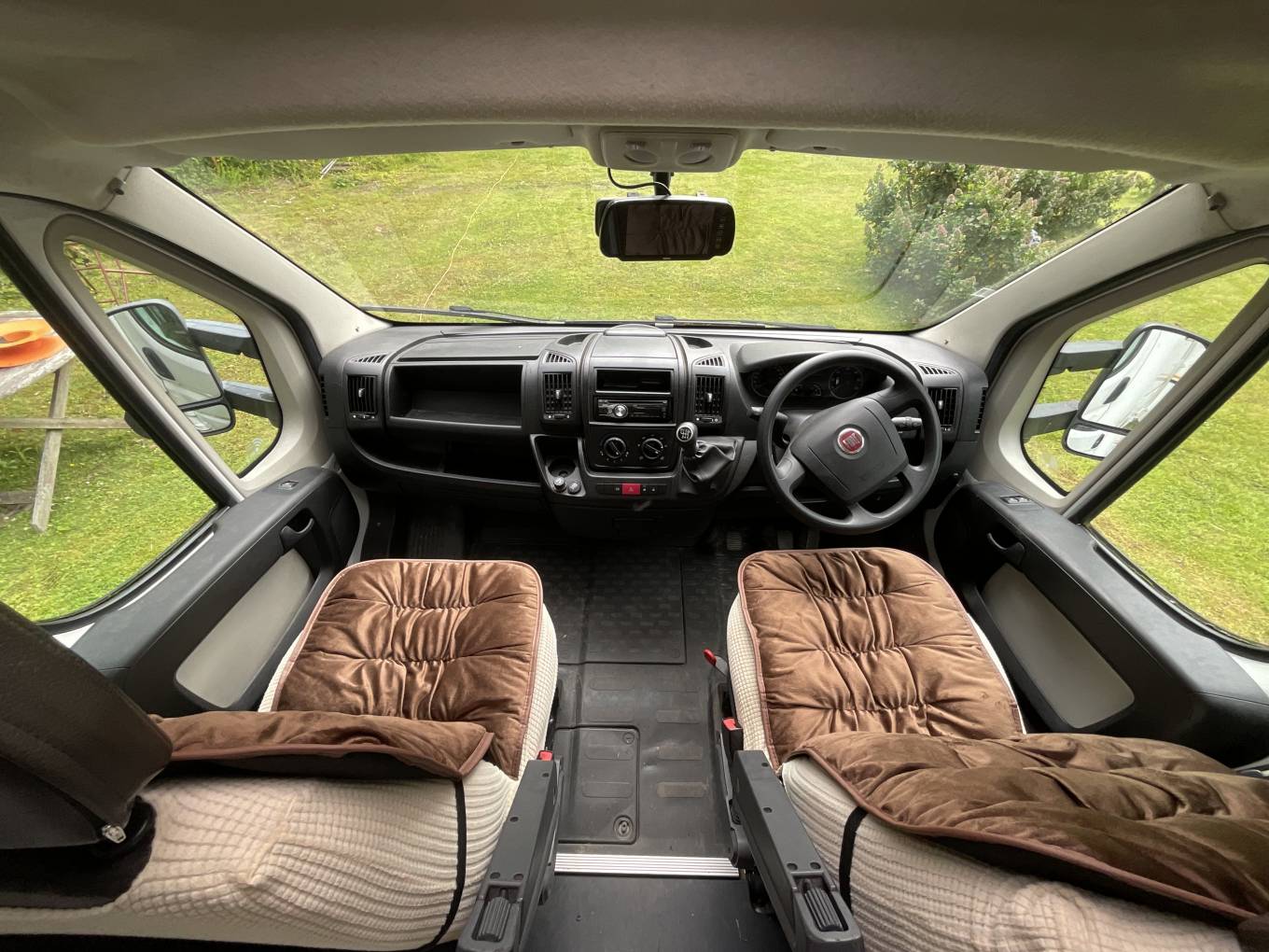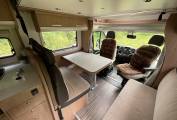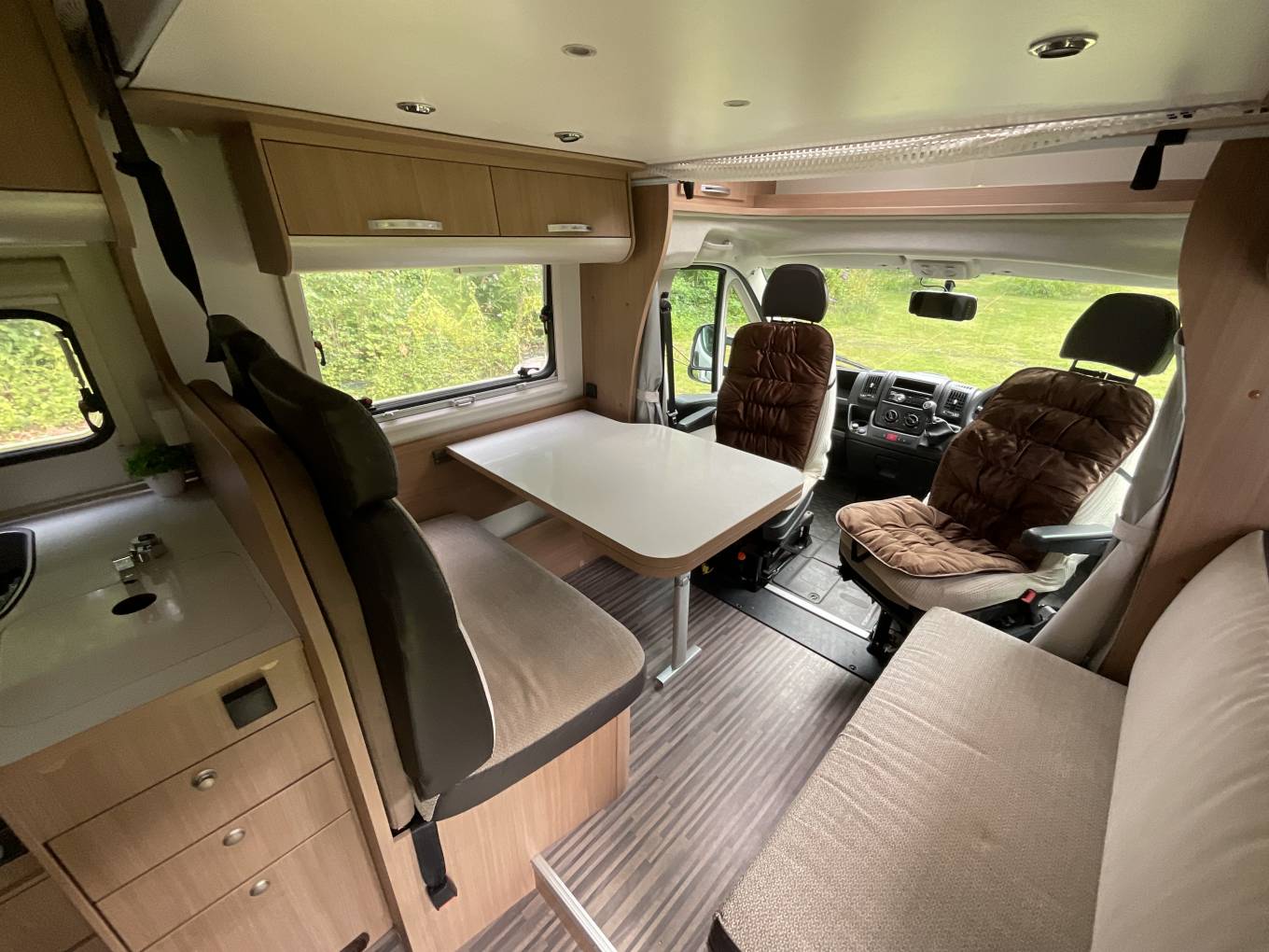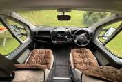 The spacious dining area is made with a forward facing double seat with 2 seatbelts, the two front seats which can be swivelled, and a side facing settee behind the drivers seat. There is a table which can easily be extended and the upholstery is part brown leather. This area can be made up into another double bed if required. There are skylights which allow plenty of light in and all the windows have blinds and fly screens. The cab also has integral blinds.