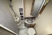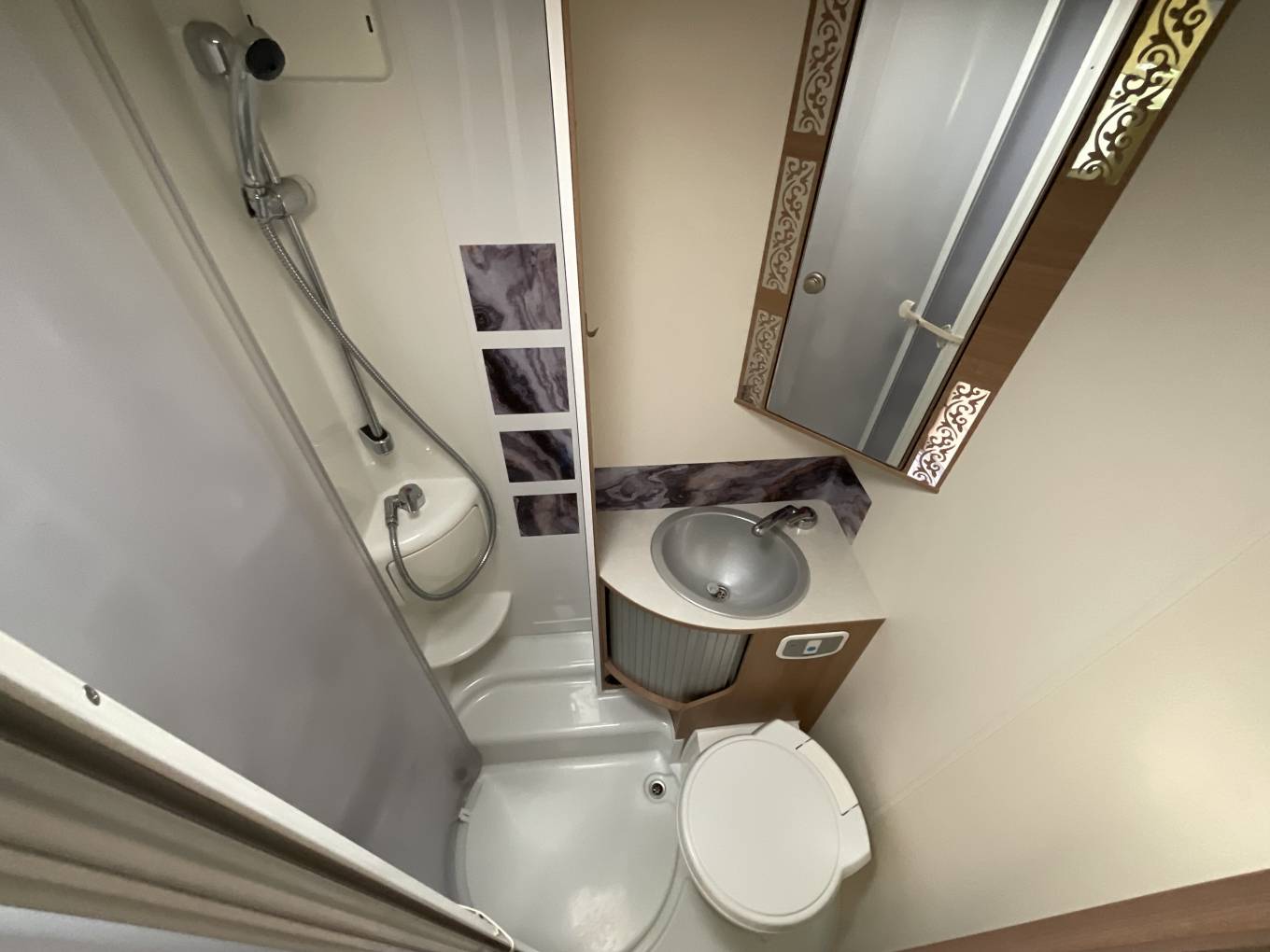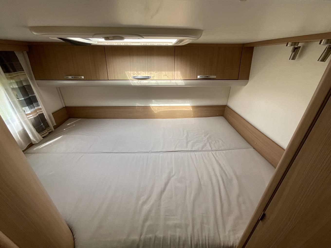 The habitation door is set on the offside. On entering there is a storage cupboard immediately to your left with a TV bracket set above it. Next comes a practical bathroom with a screen to separate the shower and then a large double bed at the rear over the garage. There are overhead lockers in this area. The steps up to the bed also act as storage boxes.
