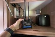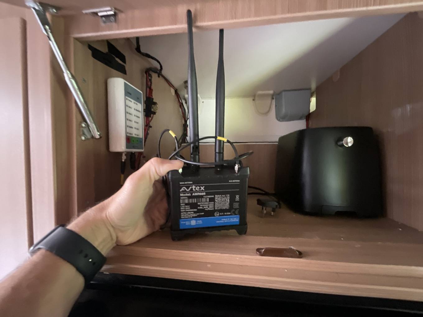 Coming forward along the nearside is a slim wardrobe with the tv aerial mechanism contained within it and drawer space then a large fridge and separate freezer, the cupboard above stores the controls for the Snipe satelite system and the Avtex Wifi box.