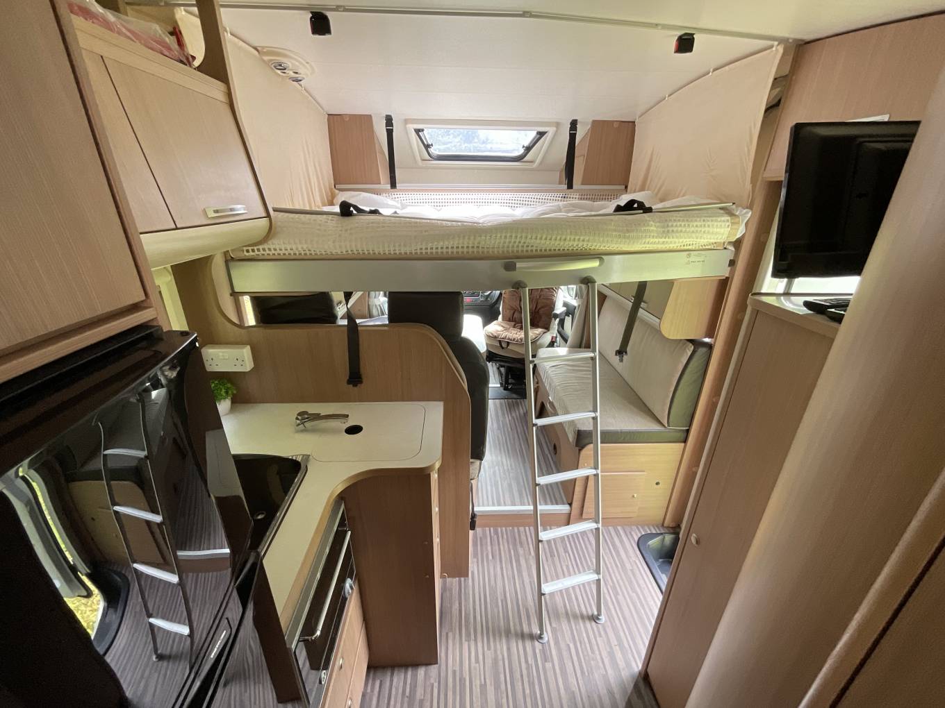 Above the dining area lives the third double bed. It can be lowered from the ceiling manually and is accessed by a ladder.