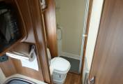 The modern corner washroom has a separate shower cubicle area with a shower screen, washbasin mixer tap, swivelling toilet with electric flush and cabinet and mirror. Next to here is a good sized fixed double bed with storage underneath, with access inside or outside.