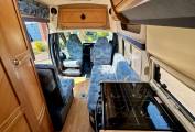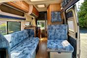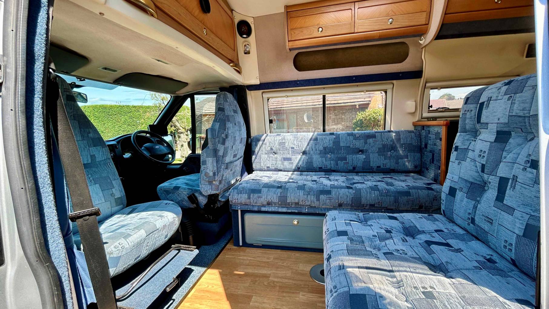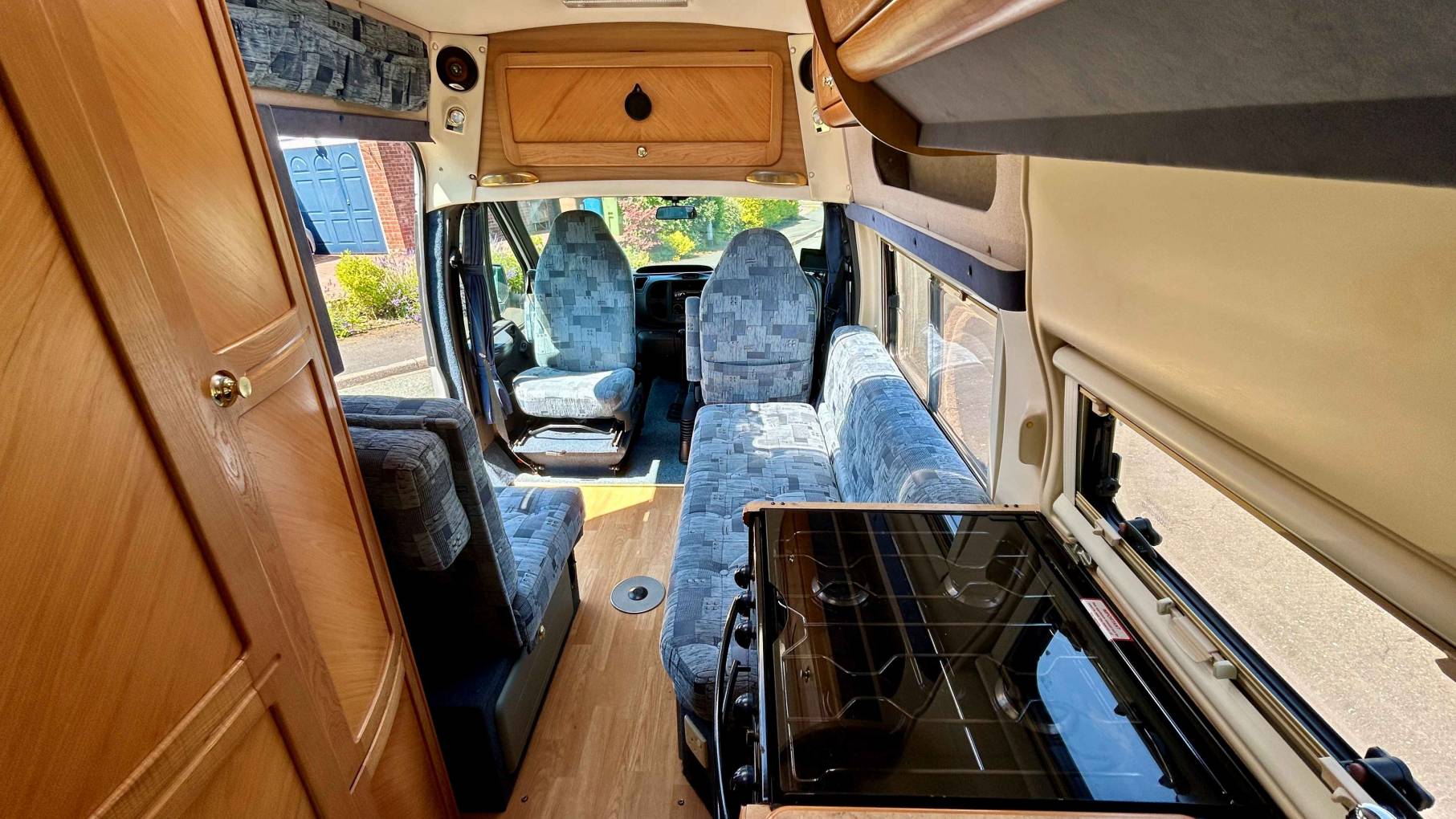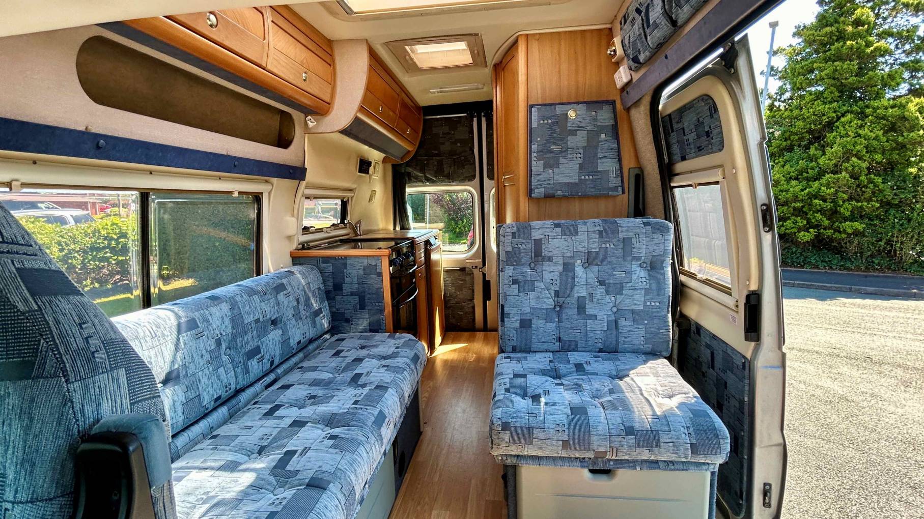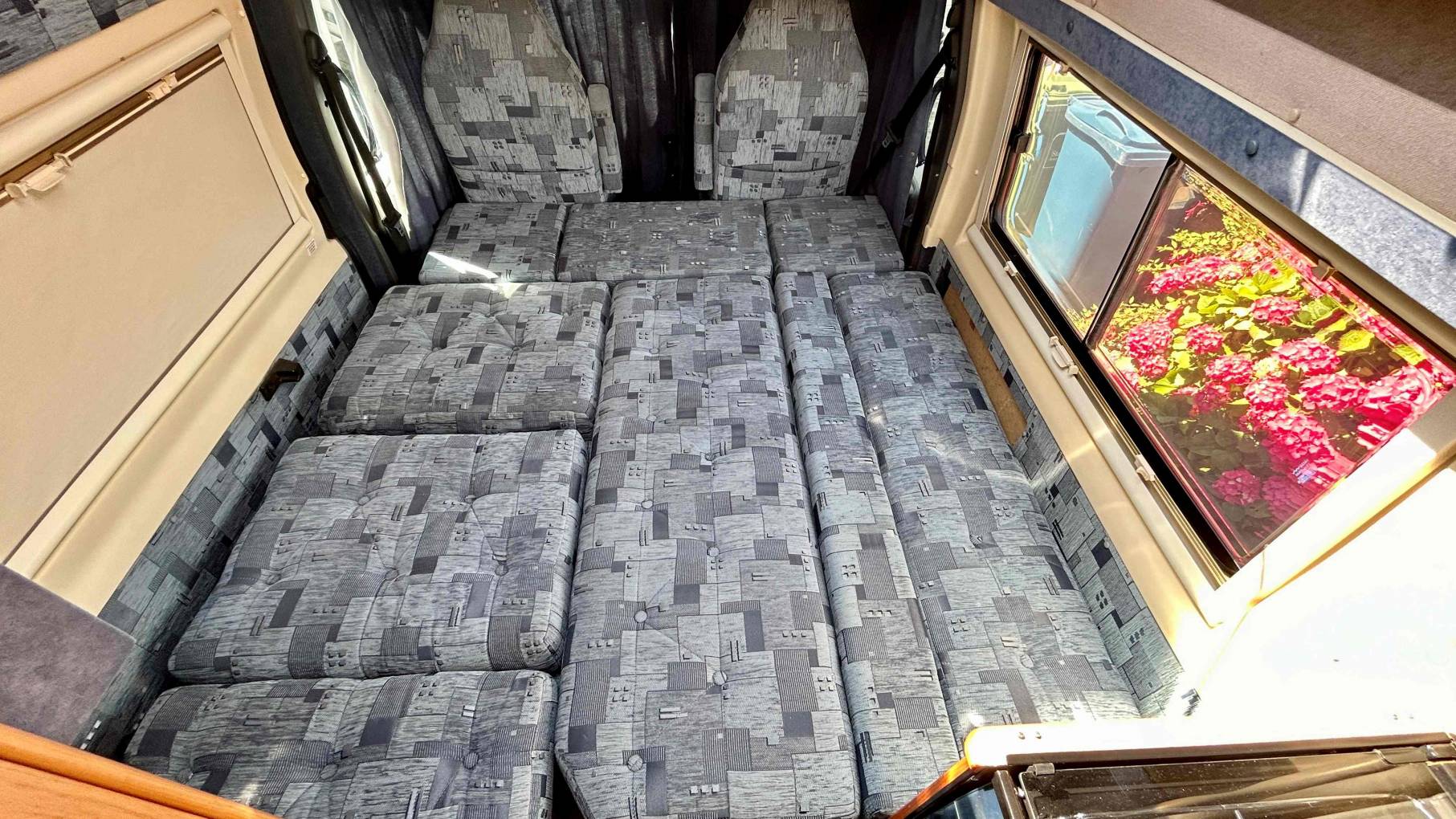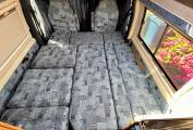 Open the side sliding door and step inside to the lounge and dining area, with a side sofa and a forward-facing single seat that has a three-point seatbelt. There are two fixing points for the 2 dining tables with a single chrome leg that stows away neatly when not in use. This area converts into two single beds or a large double bed in the evening. There are storage areas beneath the seats, a large storage cabinet above the cab, a HEKI II opening sunroof floods the lounge with natural daylight.