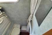 The washroom has a good-sized shower tray with shower handset connected to a dedicated tap and a shower curtain, a fold down washbasin with white mixer tap, mirrored medicine cabinet and a Thetford cassette SOG toilet. The door cleverly folds out to provide a private changing area at the rear of this van conversion.