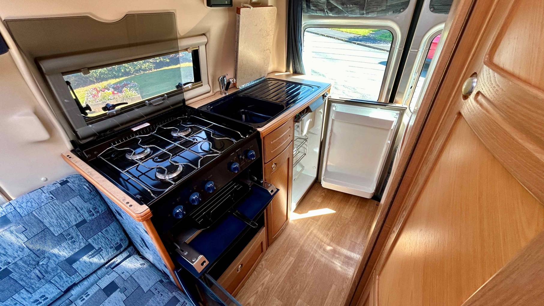 The kitchen is well appointed with a full-size cooker, a 3 gas burner hob, gas grill and gas oven beneath, a good sized kitchen sink with draining board and a chrome mixer tap, plus a three-way powered fridge with ice-box. Upper cabinets and lower cupboards provide plenty of room for all your essentials and holiday provisions.