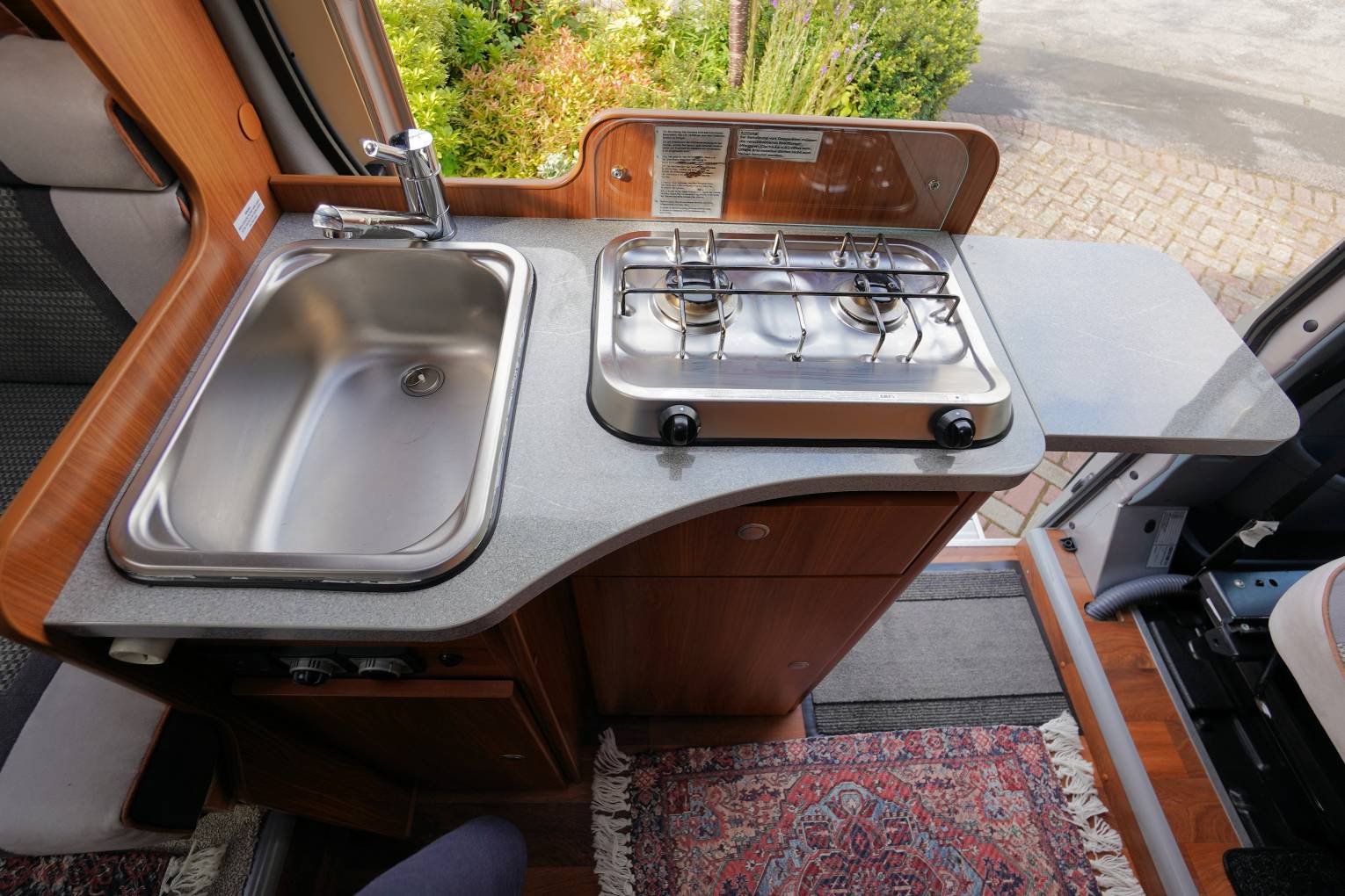 The kitchen has a 2-burner gas hob, stainless-steel sink