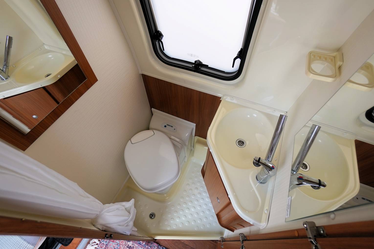 hand basin with mixer-tap that doubles as the shower head and a storage locker.