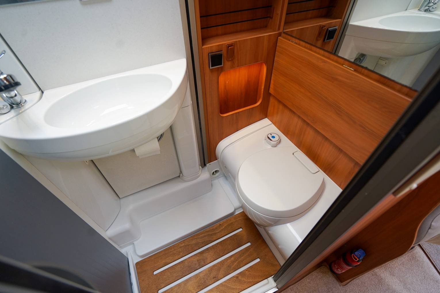washroom, in chrome and white finish, has a fixed Thetford toilet, an oval sink