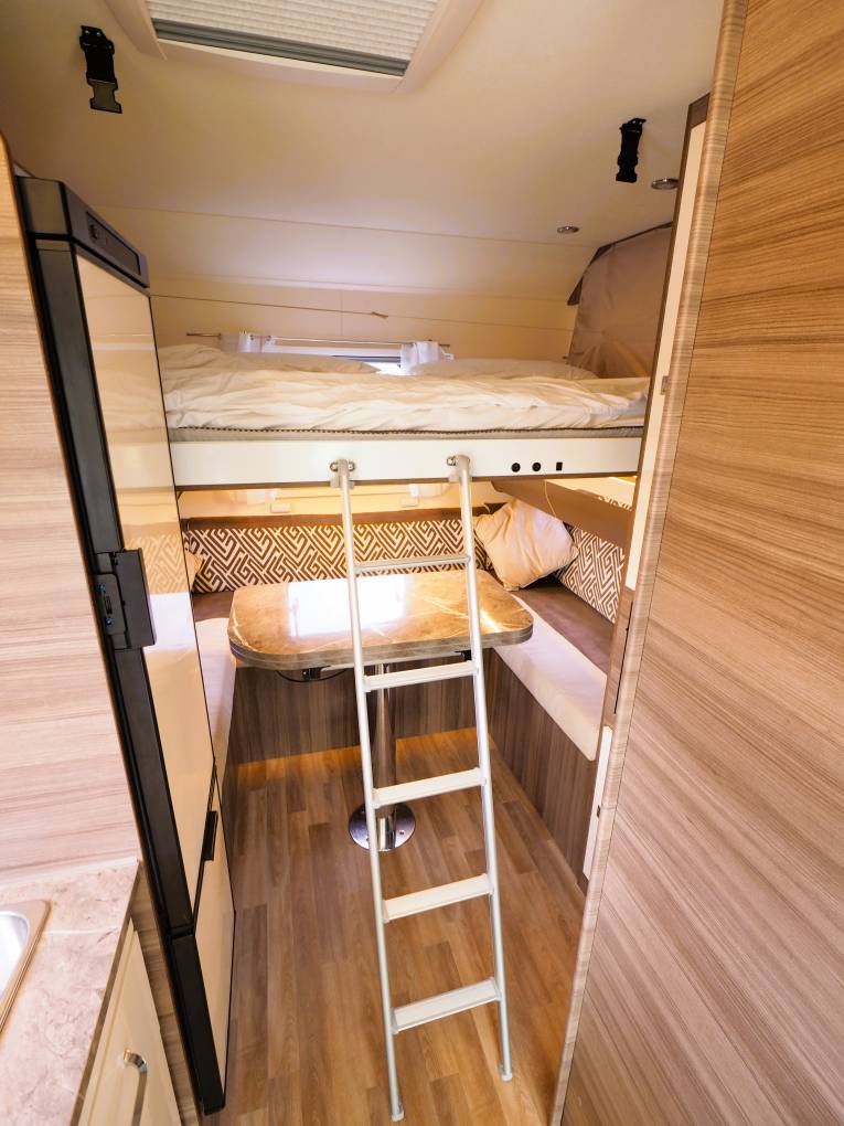 A rear lounge provides a great space for dining and entertaining and there is a separate dinette up front where both driver and passenger seats swivel into the habitation area to give plenty of seating options. The front dinette converts to a 5th adult berth but is large enough to accomodate 2 children providing the ability to sleep 6. Above the lounge and dinette are two drop down double beds that with a press of a button conveniently lift out the way to maximise space during the day. Home from home comforts with a washroom comprising a flushing cassette toilet, sink with vanity mirror and separate waterfall shower. The kitchen has all you need to prepare a meal with a 3 burner gas hob, oven, sink with mixer tap and large fridge freezer.