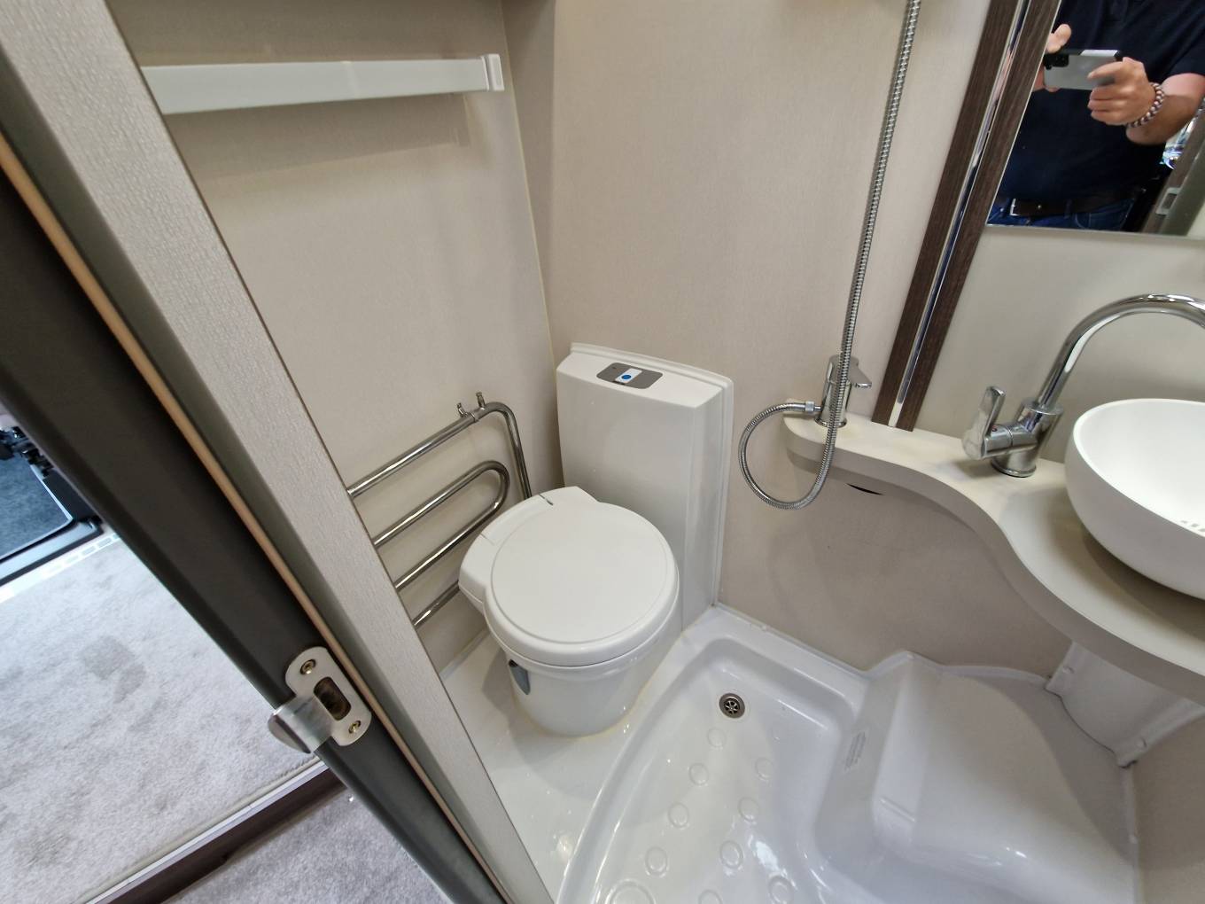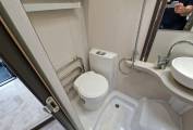 The fully equipped washroom with flushing cassette toilet, sink and vanity mirror, shower and storage cupboard provides all you need for onboard facilities.