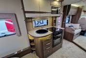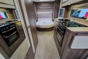 The central kitchen provides everything the most keen of cooks will need to rustle up anything from a simple snack to a full blown Sunday Roast. A duel fuel hob with three gas burners and single electric hot plate sits above the separate grill and oven. A sink with drainer and hot and cold running water is set to the side of the hob and an extendable work surface provides plenty of preparation area. A microwave oven features at head height alongside the double storage lockers and opposite is the large three way fridge freezer. To the side of the oven is drawer storage.In this area we have a Max Airfan which is controlled by remote.
