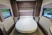 Entering the motorhome from the passenger side, the first noticeable aspect is how bright and airy the motorhome is with a luxurious feel. The large extending rear fixed double bed has a quality Hypnos mattress as found in many premium hotels. Plenty of storage with the overhead lockers, twin wardrobes and drawers and the bed lifts easily on gas struts to reveal the capacious underbed storage with external access from the rear locker door. A corner vanity unit with shelf and TV point completes the rear bedroom.
