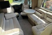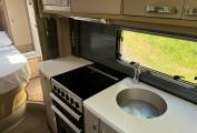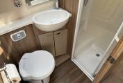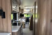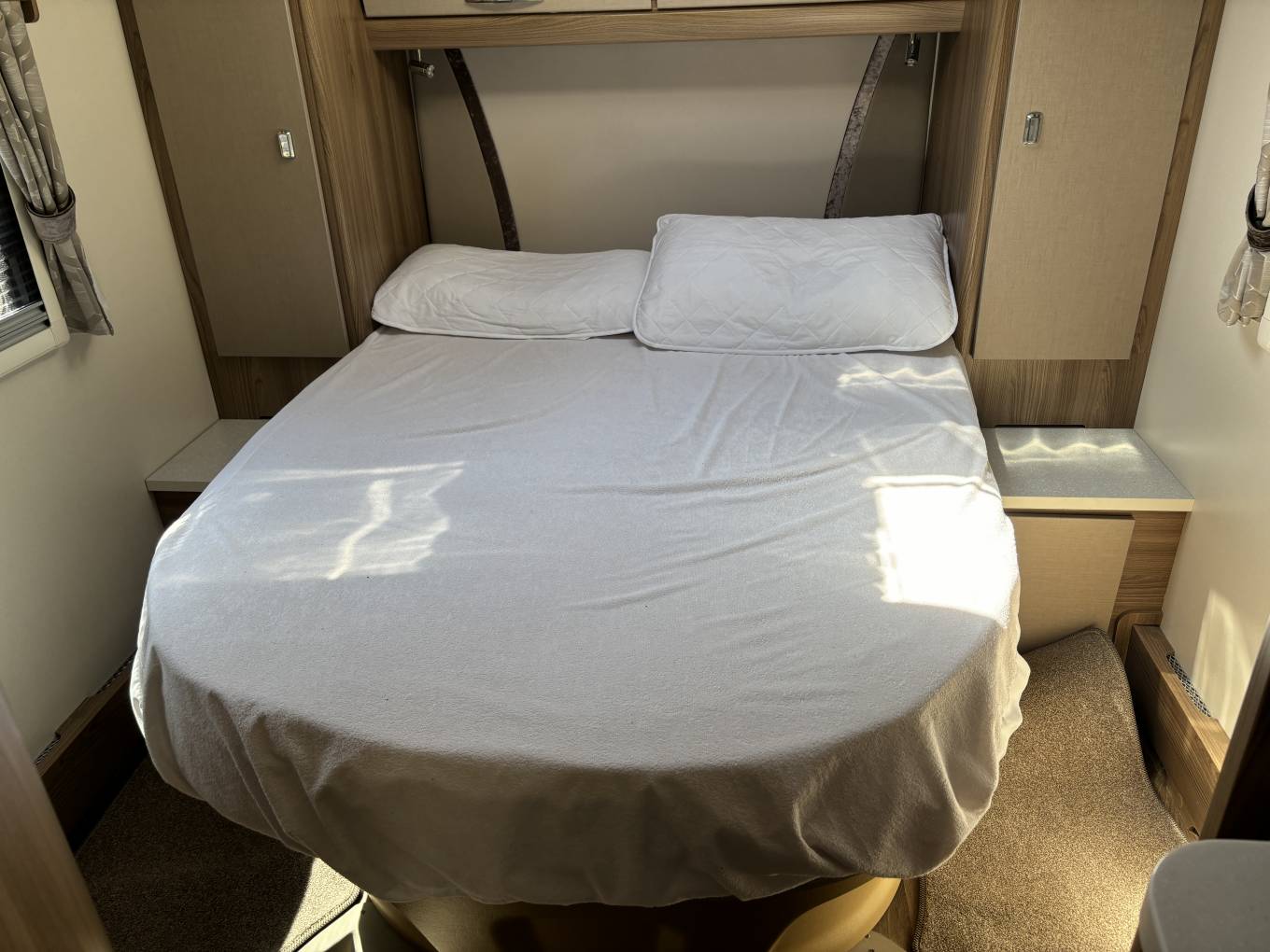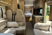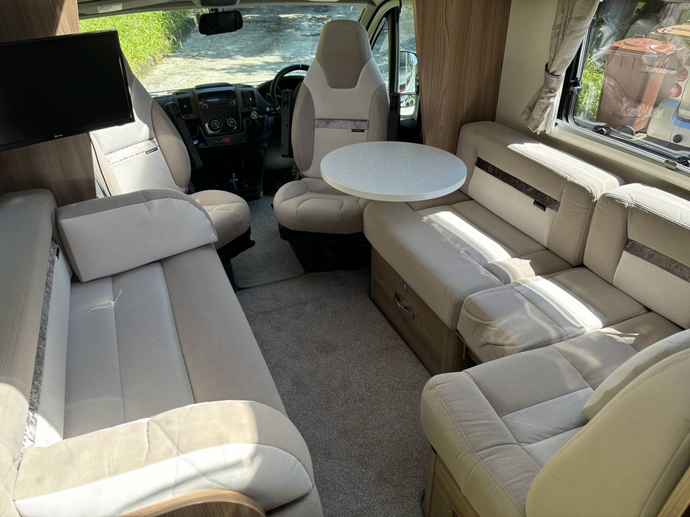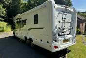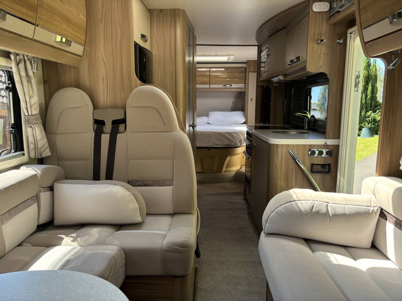 The motorhome is not short on storage, with plenty of lockers and wardrobe spaces inside, as well as a rear garage and other storage compartments accessible from the outside. Extras include wind out canopy, solar panel, bike rack, tow bar and external shower and BBQ points.